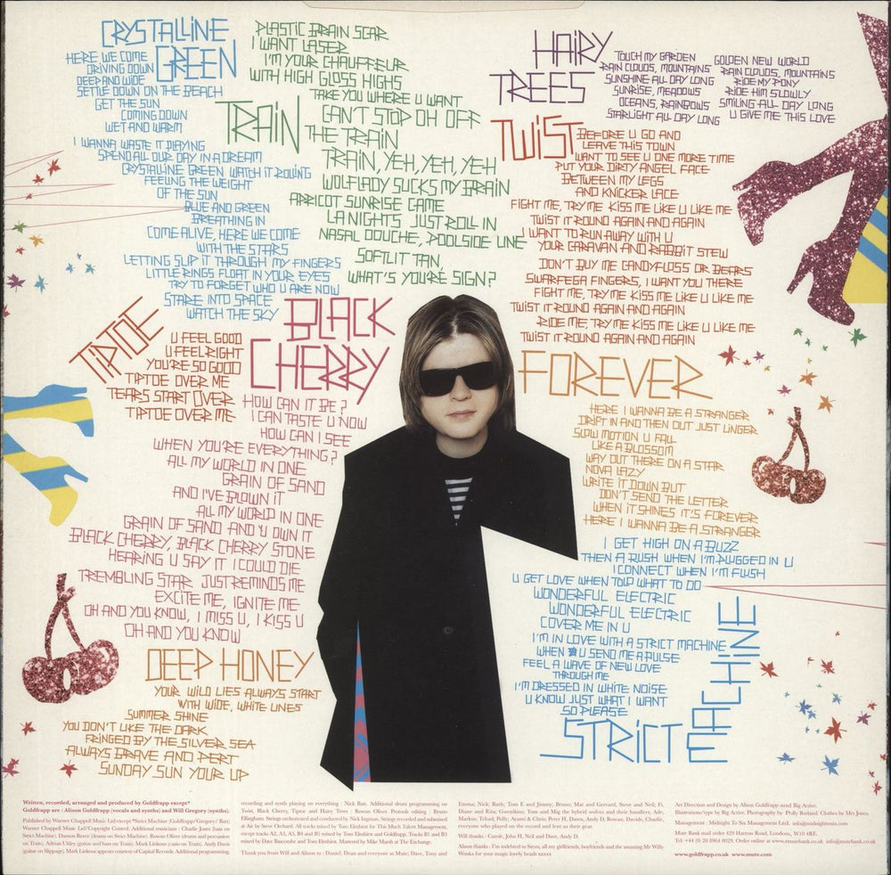 GOLDFRAPP Black Cherry (Original 2003 UK 10-track vinyl LP, the second album from the duo of Alison Goldfrapp and Will Gregory, containing more beautiful sonic nonsense and soaring vocals layered with the chilled beats that made their debut suchahit. Includes the singles 'Train' and 'Strict Machine', picture sleeve with illustrated lyric inner. The sleeve shows very little wear, the inner has a small split, and the vinyl has minimal signs of play - a wonderful copy STUMM196)