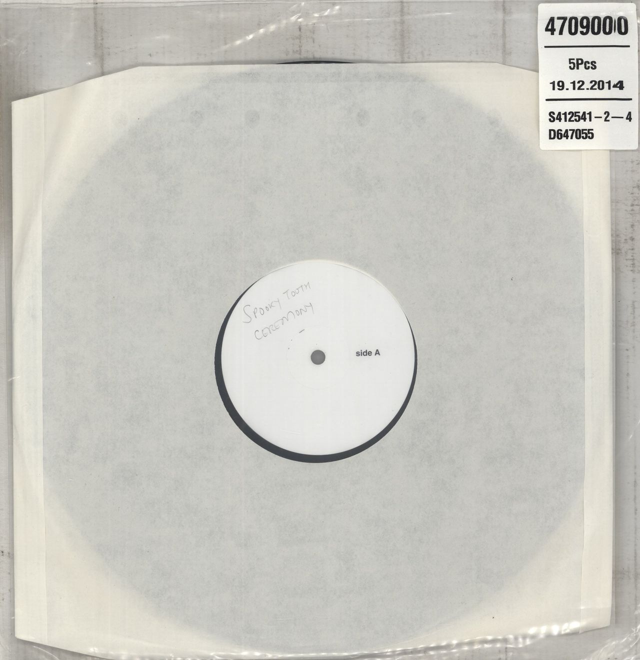 SPOOKY TOOTH with PIERRE HENRY Ceremony (2015 UK/EU 6-track white label vinyl LP test pressing, for the limited edition reissue of the of the group's studio album released in 1969, featuring an electronic mass written by Pierre Henry and GaryWright. These would have been pressed to check the quality & the sonics ofthe pressing before the finished product was manufactured. Plain white labels with the album title hand written, housed in a plain die-cut sleeve in a plastic sleeve with catalogue number & date sticker attached, dated 16.01.2015)