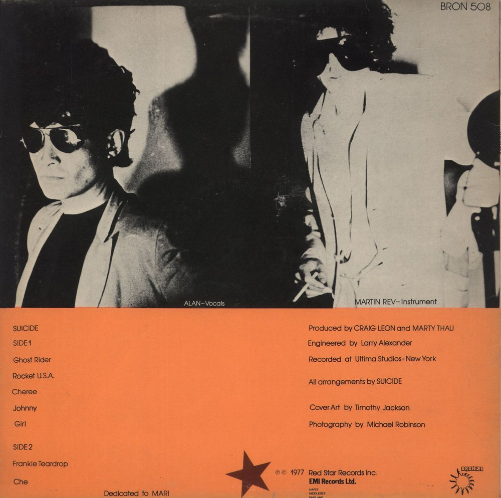 SUICIDE Suicide (Autographed 1977 UK 7-track stereo vinyl LP. This copy of the classic debut album from the cult NY duo has been signed in red biro by Alan Vega as 'Alan'. Dedicated to a friend 'Babs' with a personal message of supportand includes; "you're a beautiful person, everything's gonna be alright". Obtained from a life-long fan of the band who attended many performances by them in the UK and US, the signed LP was a gift from Alan Vega and taken from his own personal collection [why Babs gave the album back to Alan we will never know!]. The picture sleeve shows just a little light shelfwear and the vinyl grades Excellent with a couple of hairlines/scuffs not affecting play. A truly unique signed album from one of the key acts of the late '70s NY underground BRON508)