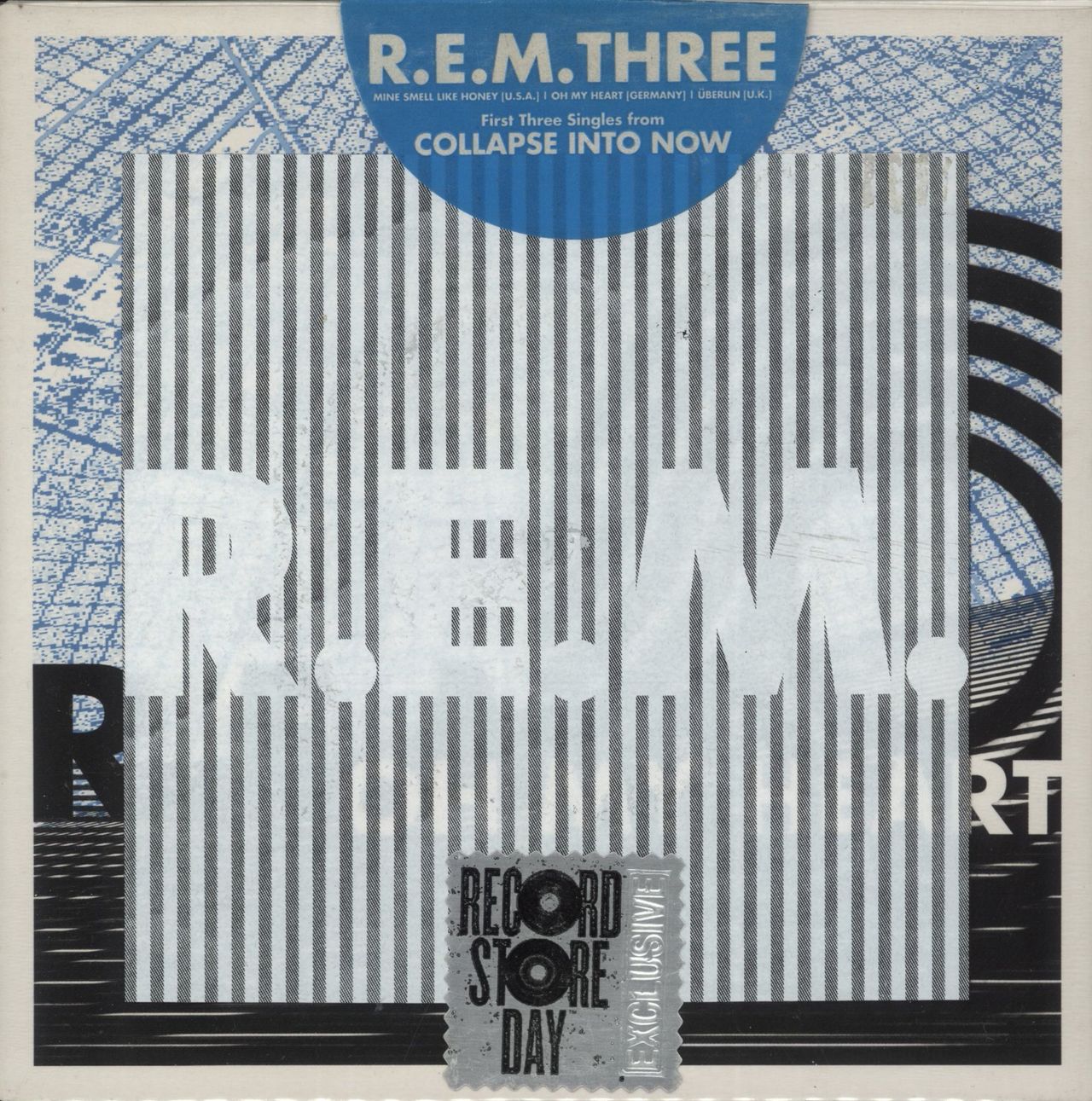 REM R.E.M. Three (2011 US Record Store Day exclusive limited edition set of THREE vinyl 7" singles from 'Collapse Into Now', featuring live B-side tracks never before issued in any form recorded during 2008. Each single is issued in its own picture sleeve and housed in a custom printed PVC protective sleeve with intact hype sticker seal across the opening edge and silver 'Exclusive' embossed Record Store Day sticker on the front. )