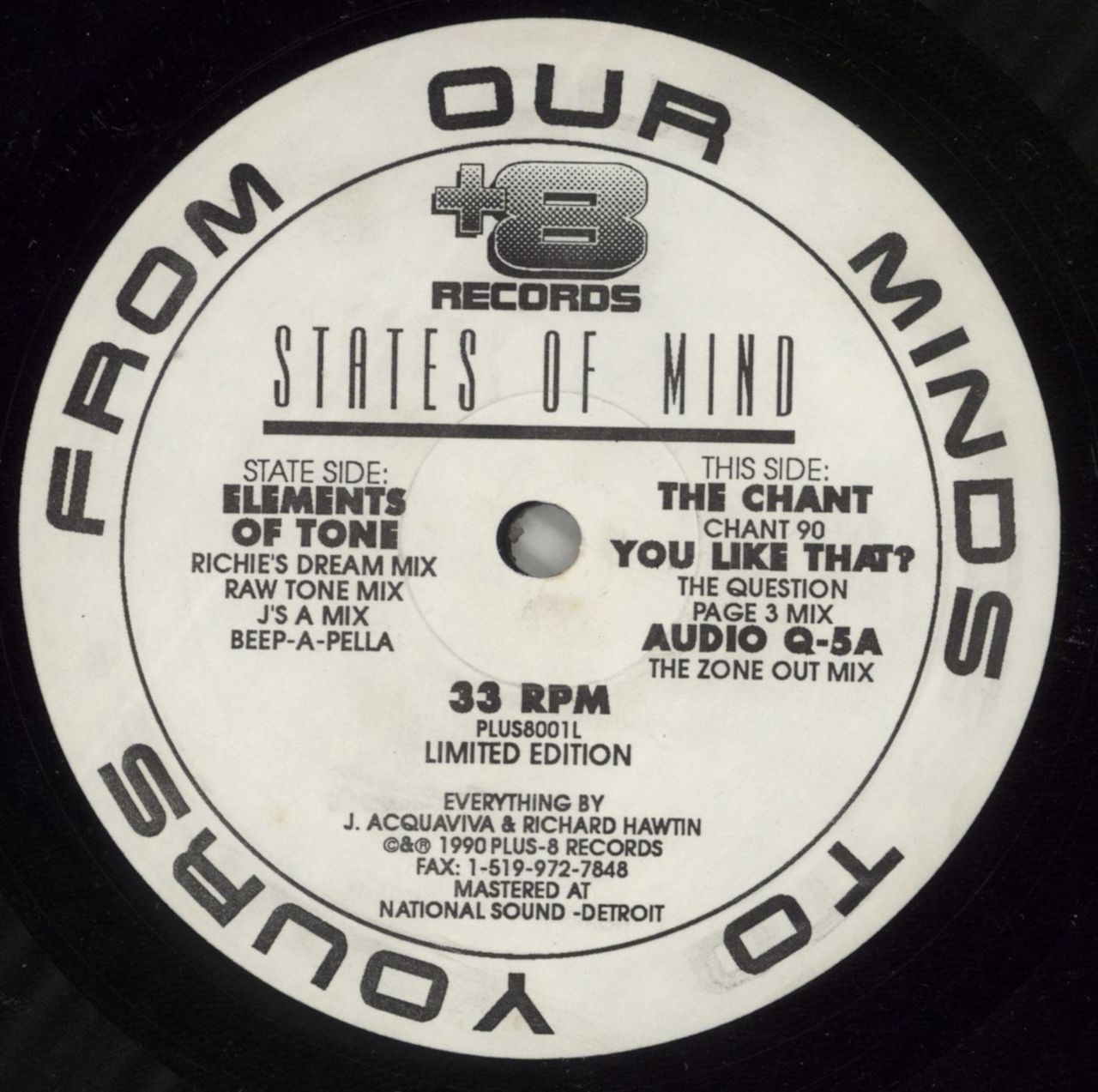 STATES OF MIND Elements Of Tone (Scarce 1990 US 8-track 12" EP, die-cut sleeve. Very early Plus 8 release from label founders Richie Hawtin and John Acquaviva under their States Of Mind alias - hard-hitting Detroit inspired techno with elements of the [then] contemporary UK 'bleep 'n' bass' sound. The label has a pen annotation to one side and the vinyl has a couple of visible scuffs/sratches, nothing excessive, and grades Very Good PLUS8001L)