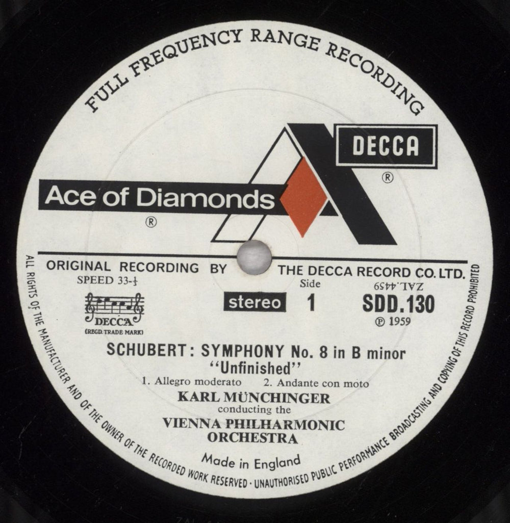 KARL MUNCHINGER conducts the VIENNA PHIHARMONIC ORCHESTRA Schubert: Symphony No. 8 "Unfinished" / Symphony No .2 (1966 UK issue of the 1959 stereo 6-track vinyl LP on the Ace Of Diamonds label, front laminated picture sleeve. The sleeve showsminimal wear and the vinyl appears barely played SDD130)