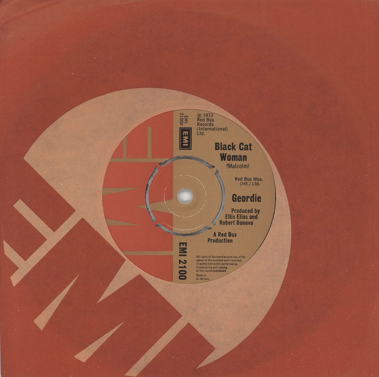 GEORDIE Black Cat Woman (1973 UK 7" vinyl single with an intact four prong centre, also including Geordie's Lost His Liggie. Issued in an EMI company die-cut paper sleeve, the vinyl appears barely played. This is the first copy of the commercial release that we've seen since the Mid 90s! EMI2100)
