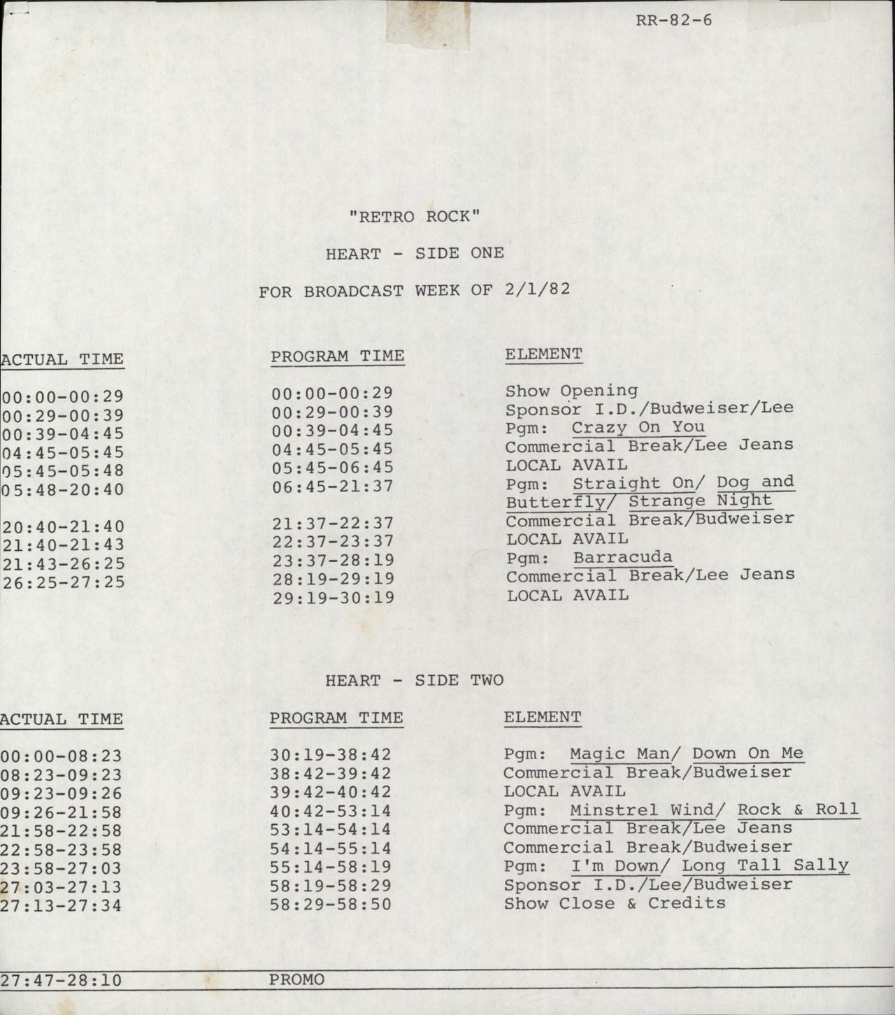 HEART Retro Rock (1982 US industry-only 10-track vinyl LP, released for radio broadcast by Clayton Webster Corporation, plain die-cut sleeve with cue sheet. The vinyl is Excellent with little sign of play RR-82-6)
