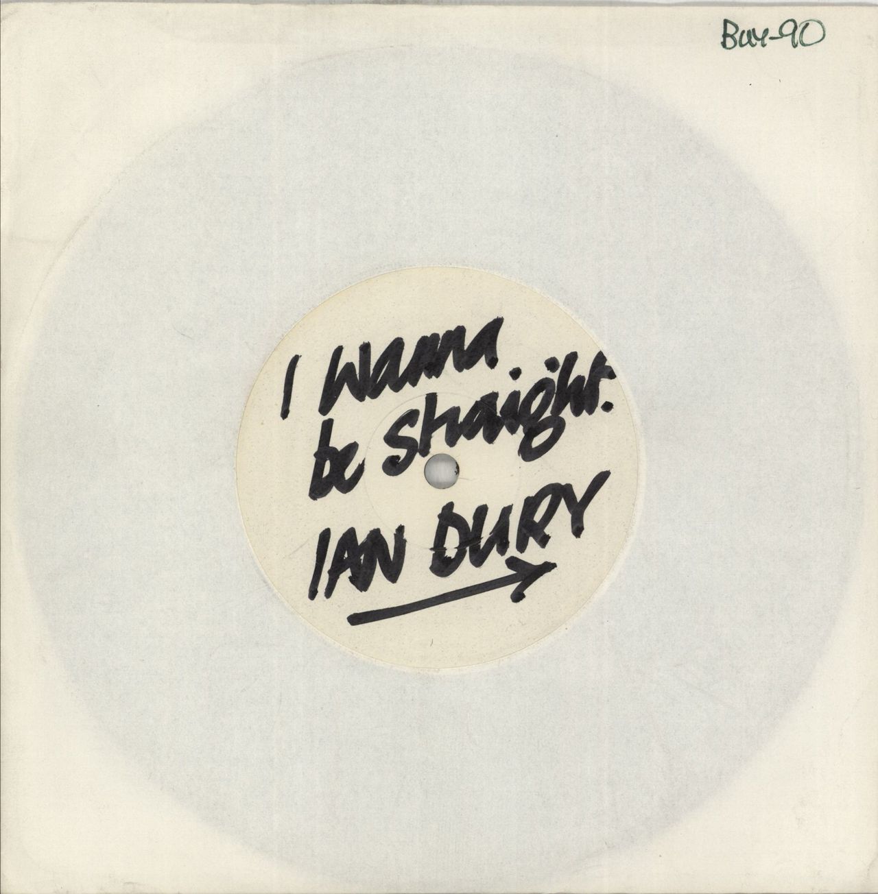 IAN DURY I Wanna Be Straight (1980 UK official promotional white label 7" vinyl single with hand-written A-Side label [plain B-Side] and 'BUY90' matrices. Hard-to-find pre-release copy backed with the non-album track That's Not All, die-cut paper sleeve. Obtained from a former Stiff Records employee the vinyl is in Near Mint condition forty-five years on! BUY90)