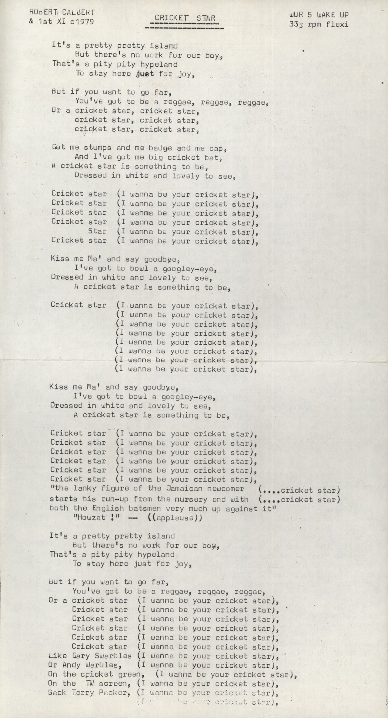 ROBERT CALVERT Cricket Star + Insert (1979 UK single sided 7" green flexidisc playing at 33RPM, housed in a clear PVC sleeve with it's lyric/discography insert. The disc is in Excellent condition with a couple of faint crease marks, ideal asa collection filler & hard to find WUR5)