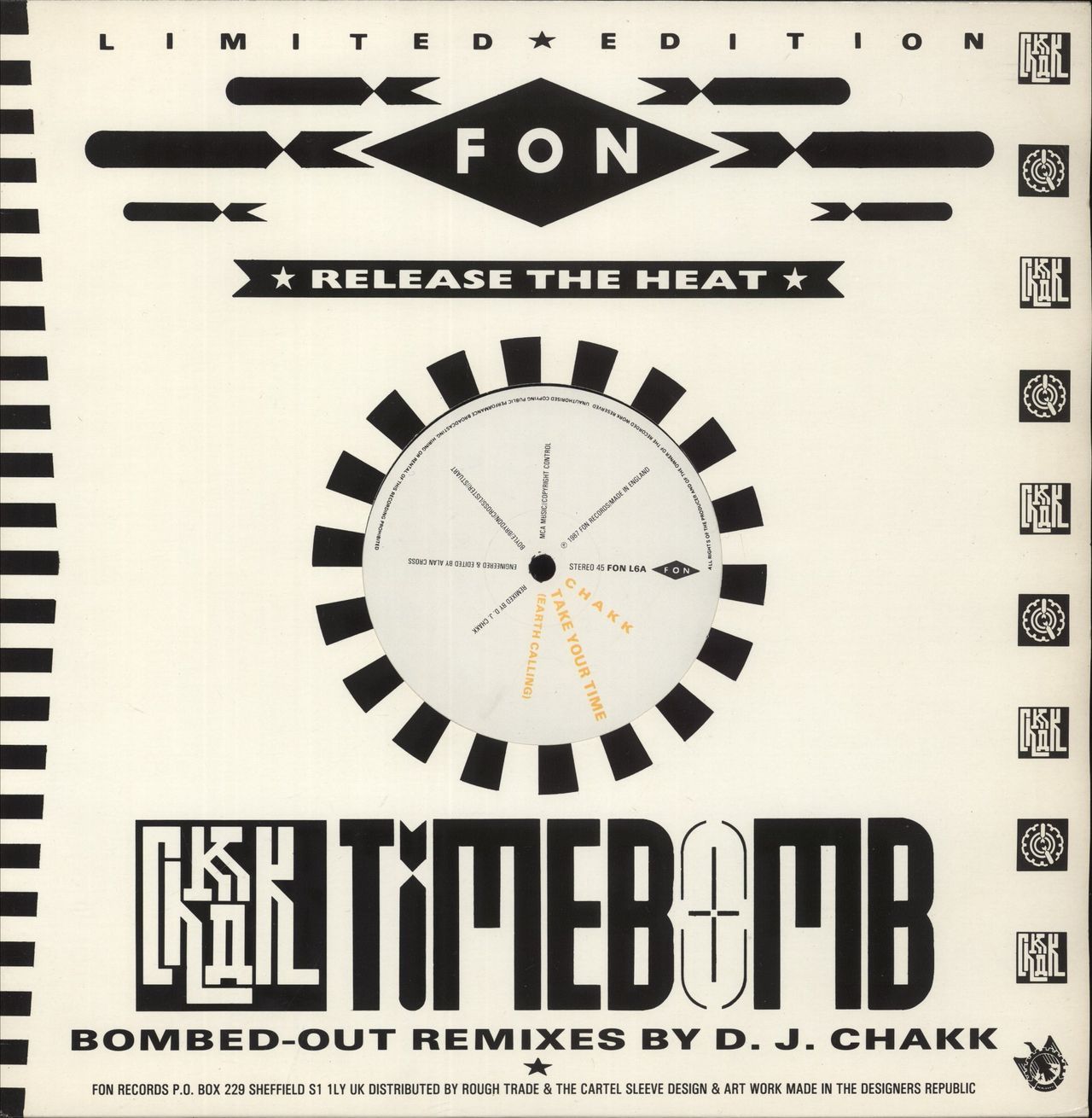 CHAKK Timebomb (1987 UK limited edition 4-track 12" vinyl EP the Bombed-Out remixes by D.J. Chakk; including Take Your Time [Earth Calling] plus three mixes of Just Pieces. The vinyl remains in excellent condition within the FON company die-cut title sleeve)