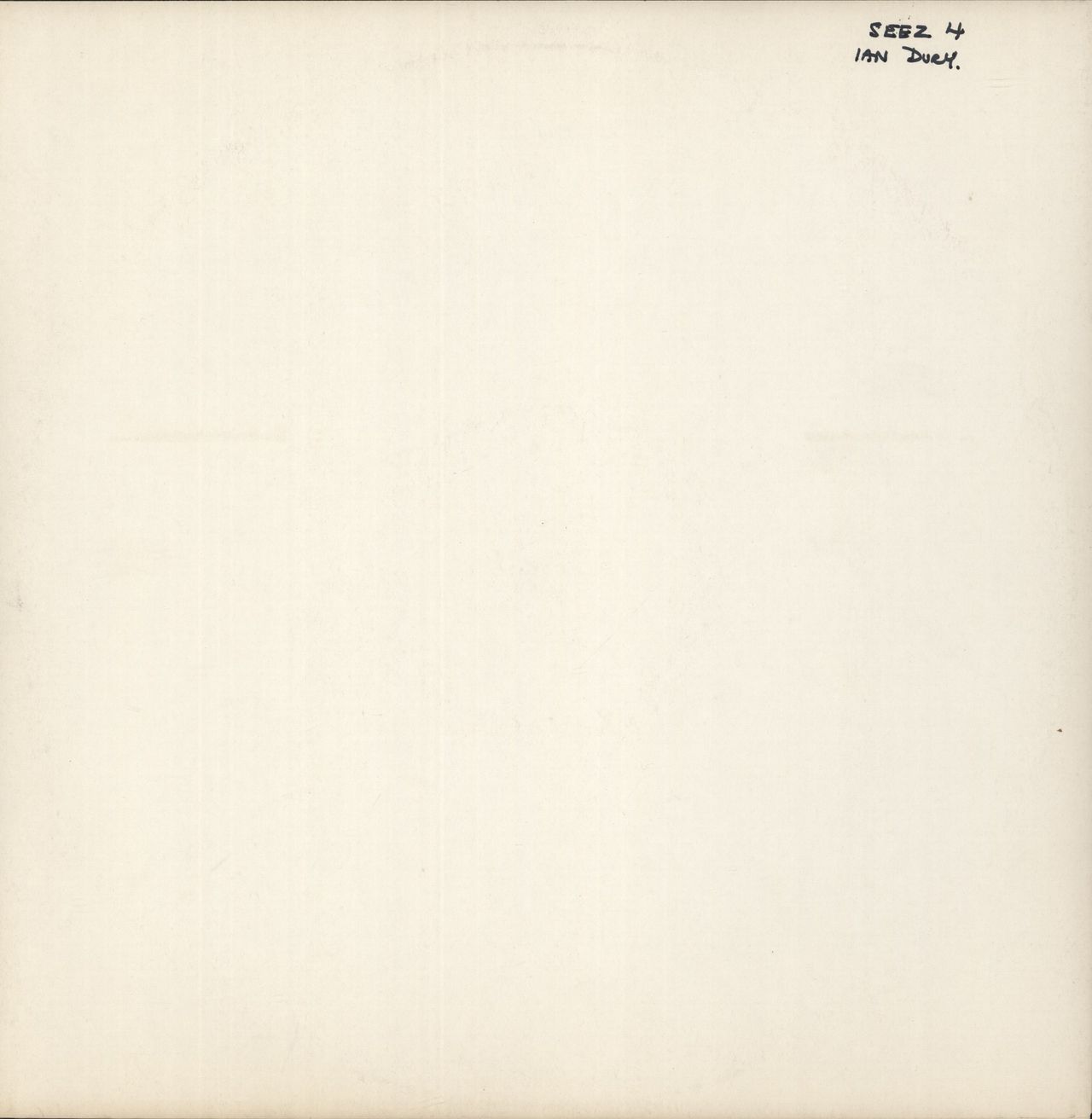 IAN DURY New Boots And Panties (Rare 1977 UK 11-track white label black vinyl LP test pressing lacquer cut at Trident Studios, with 'TRIDENT STEVE SEEZ 4A-79 E.G.' & 'SEEZ 4 B-79 SRA E.G.' matrix details, including the extra track Sex, Drugs &Rock & Roll. Housed in a plain card sleeve with just the catalogue number 'SEEZ 4' & artist name hand written. This was manufactured solely to check the quality & the sonics of the pressing before the finished product was manufactured. Obtained from a former Stiff Records employee, this has just a few light signs of play, the first example we have ever seen and a British Punk era classic)