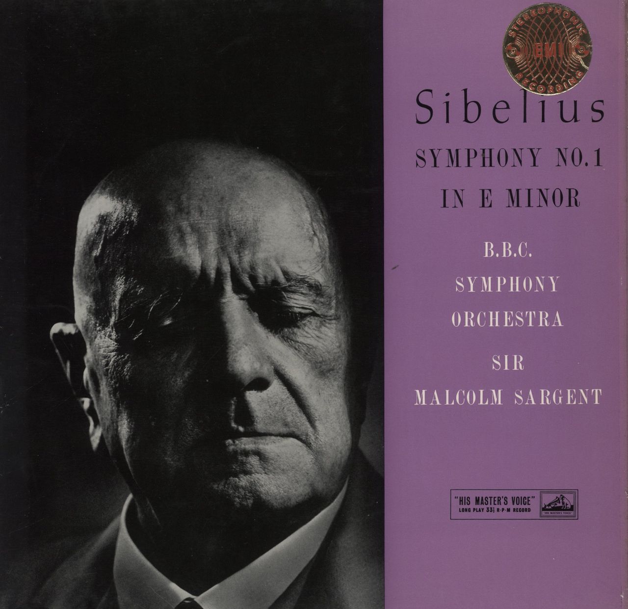 SARGENT conducts THE BBC SYMPHONY ORCHESTRA Symphony No. 1 In E Minor (1959 UK 1st issue 4-movement stereo LP on the gold & cream HMV 'Nipper' label, fully laminated picture sleeve with scalloped flipbacks and gold 'stereophonic' sticker to the front. The sleeve shows minimal wear and aside from a couple of faint scuffs, the vinyl shows minimal sign of play - a superb copy! ASD260)