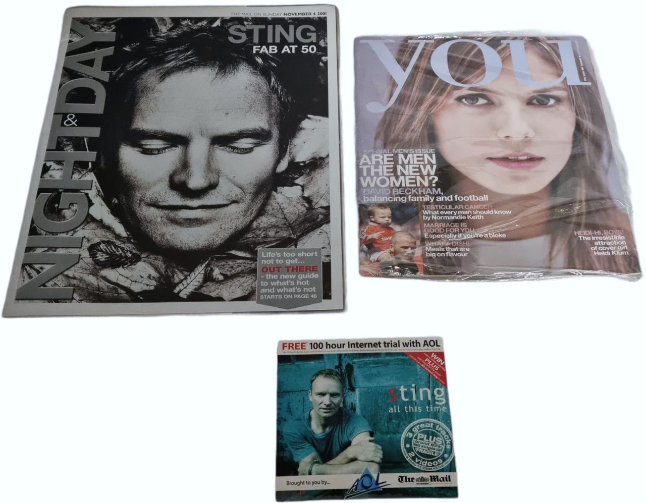 STING All This Time (2001 UK promotional only Enhanced CD in picture sleeve featuring 4 audio tracks including Fragile plus live tracks: A Thousand Years, If You Love Somebody... and After The Rain Has Fallen. CD-Rom section features the videos for Fragile & After The Rain Has Fallen, behind- the-scenes footage & a link to Sting's official web-site PLUS this is accompanied by the original 'Sting Fab At 50' Mail On Sunday magazine with 6-pageinterview article and superb black and white cover picture by Michel Comte)