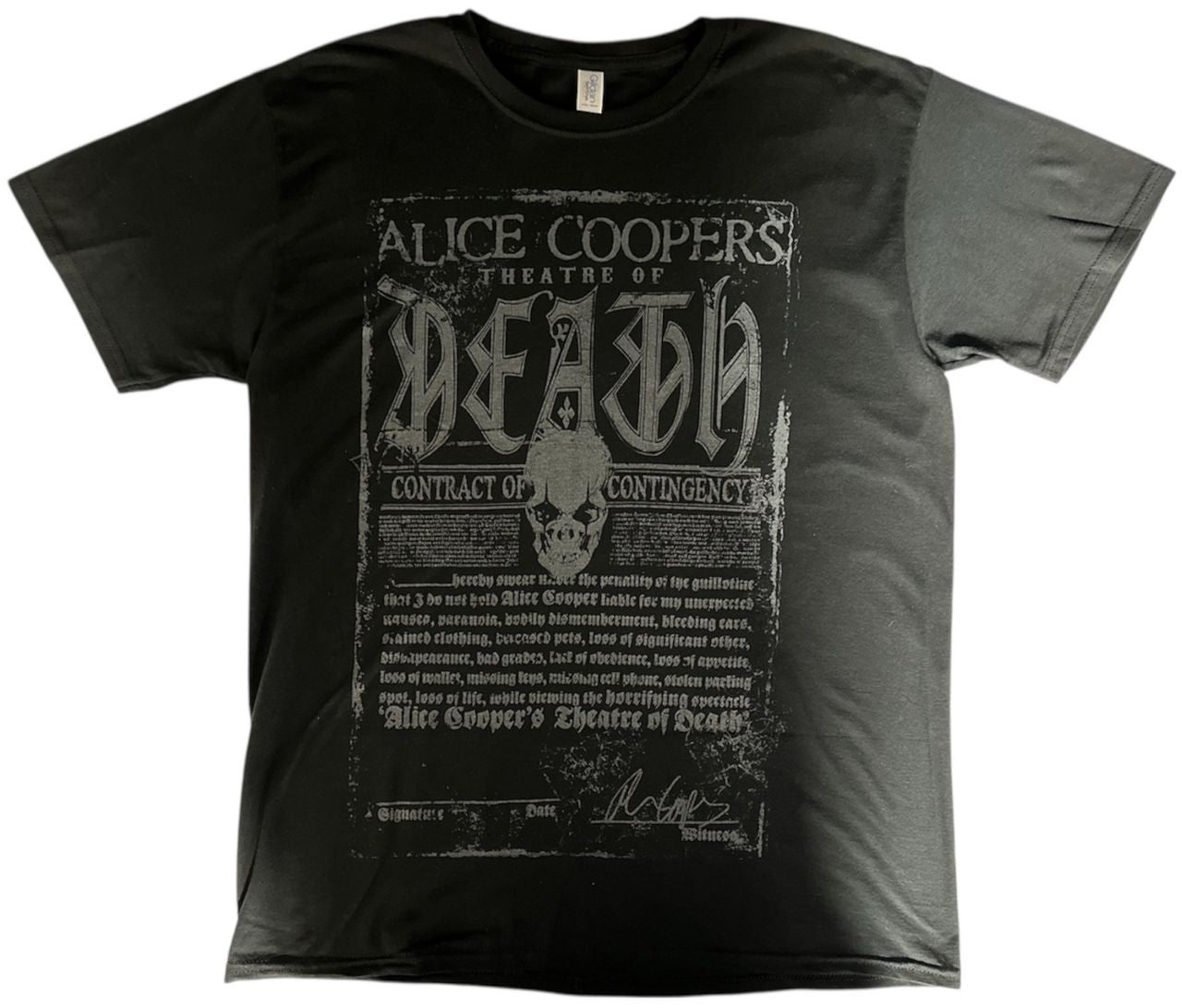 ALICE COOPER Theatre Of Death Tour 2009 (2000s original black t-shirt. The front image shows a delightful made-up skull with a 'Contract of Contingency', and the back lists all 48 dates of the tour, from Pennysylvania to Sweden. Made from 100%cotton with its original Gildan Softstyle label intact inside the collar. Overall, the garment shows minimal wear and retains its vibrant colour print to the front and back)