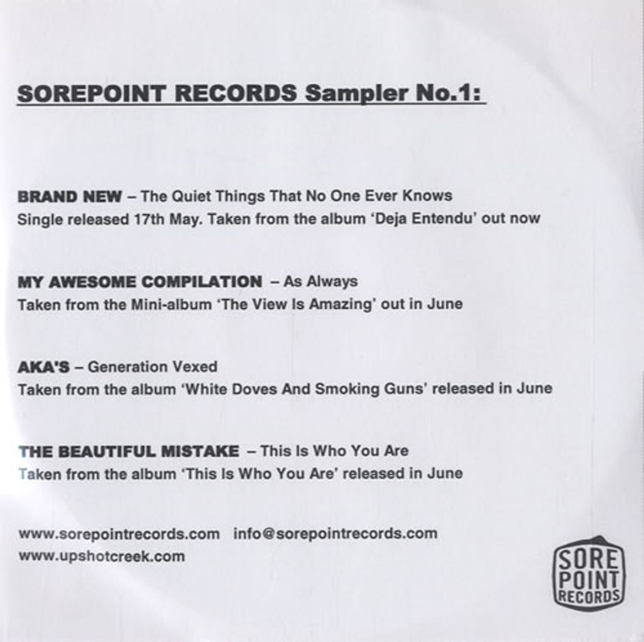 BRAND NEW / VARIOUS Sorepoint Records Sampler No. 1 (2004 UK 4-track advance promotional sampler CD-R which features The Quiet Things That No One Ever Knows along with tracks by My Awesome Compilation, AKA's & The Beautiful Mistake, custom printed disc with wraparound title sleeve in clear PVC wallet)