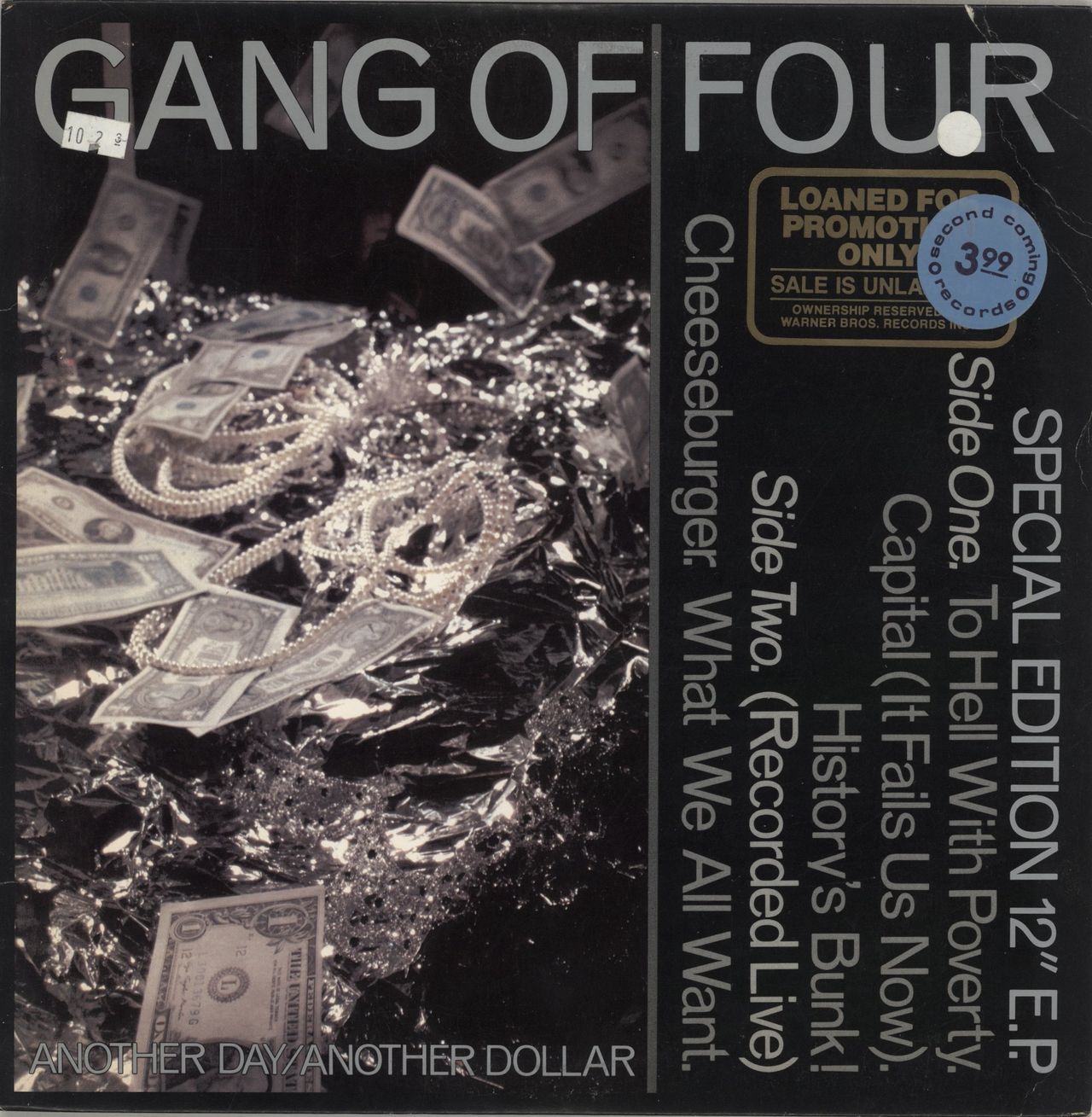 GANG OF FOUR Another Day / Another Dollar (1982 US 5-track 12" vinyl EP featuring To Hell With Poverty, Capital [It Fails Us Now], History's Bunk! & live versions of Cheeseburger & What We All Want recorded at The Hammersmith Palais in Londonon30th March 1981, housed in a single pocket picture sleeve with has a promotional gold flash on the front, as well as a vintage record store sticker slightly obscuring it. The sleeve shows some light corner creases and the vinyl displays a single cosmetic scuff not impacting play MINI3646)