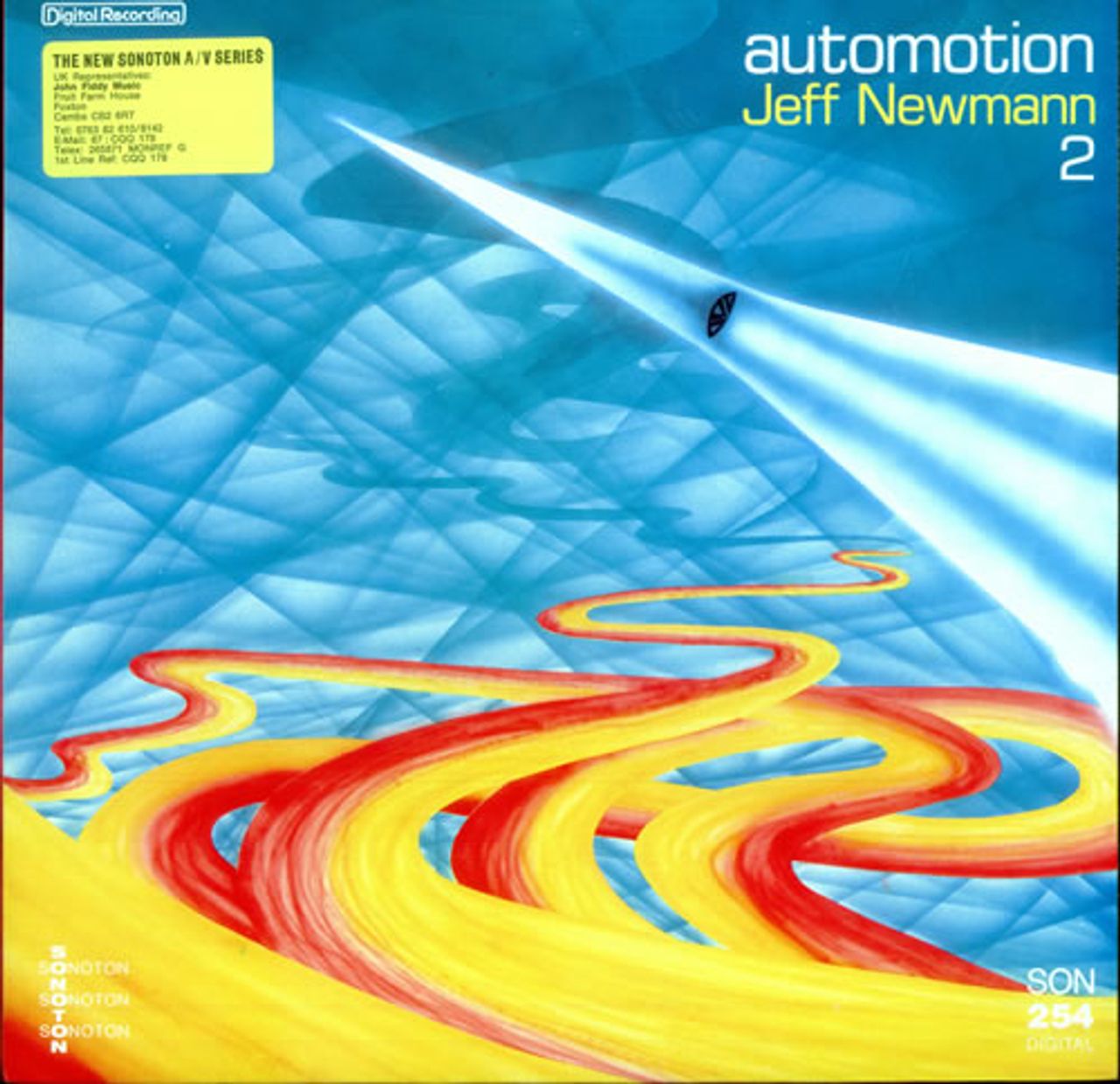 JEFF NEWMANN Automotion 2 (Early 80s German Direct Metal Mastered 12-track vinyl LP of cosmic synth science on 'future aspects of current pop', issued as part of the Munich based Sonoton library. The picture sleeve is custom stickered with details of Sonoton's UK representative John Fiddy, and despite a 1" split in the paper along the top edge, this is otherwise a mint copy SON254)