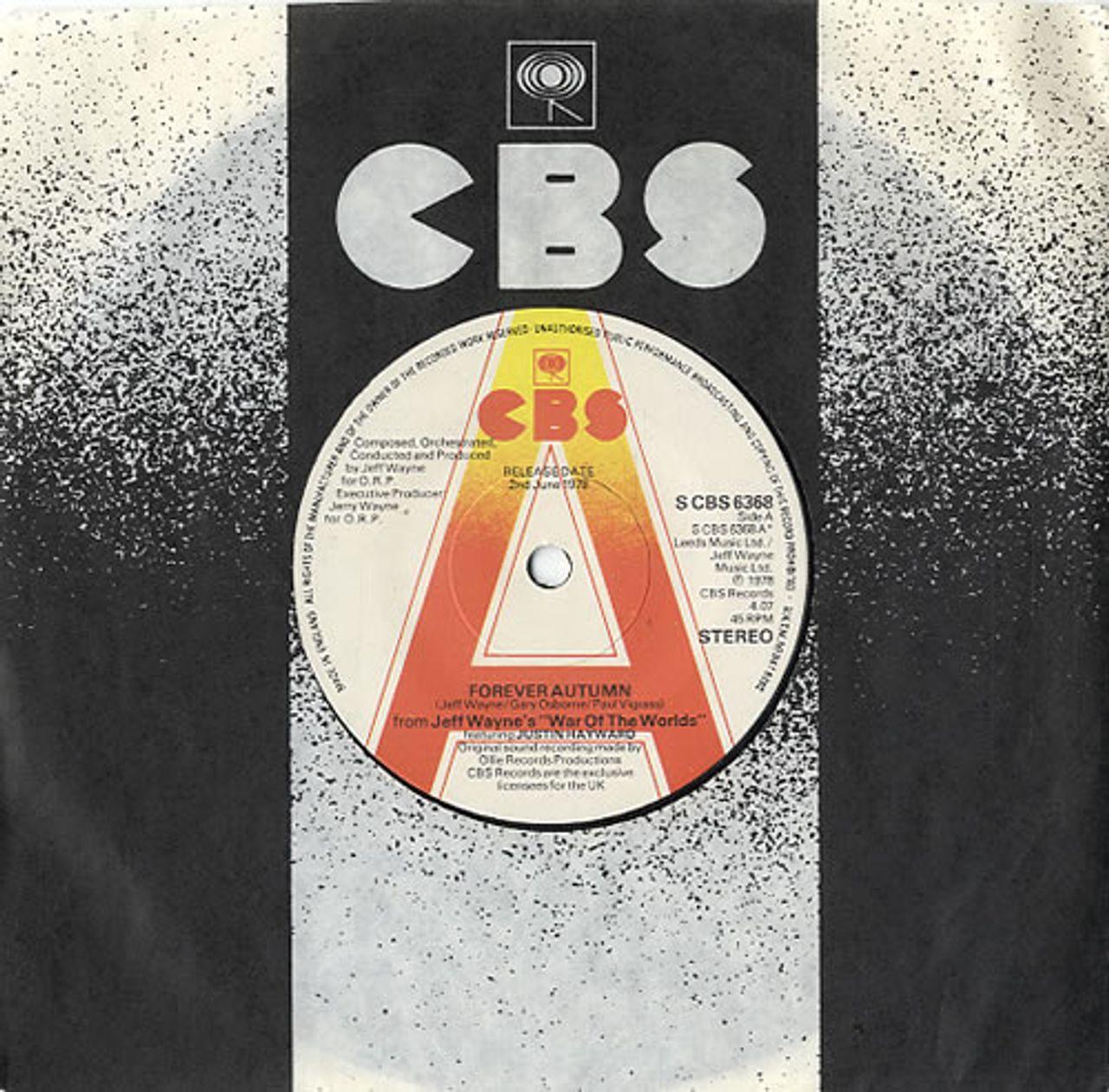 JEFF WAYNE featuring JUSTIN HAYWARD Forever Autumn (1978 UK solid centre 'A' label advance promotional vinyl 7" for the single release, with release date of 2nd June 1978 on the label, also including The Fighting Machine, CBS company die cut paper sleeve SCBS6368)