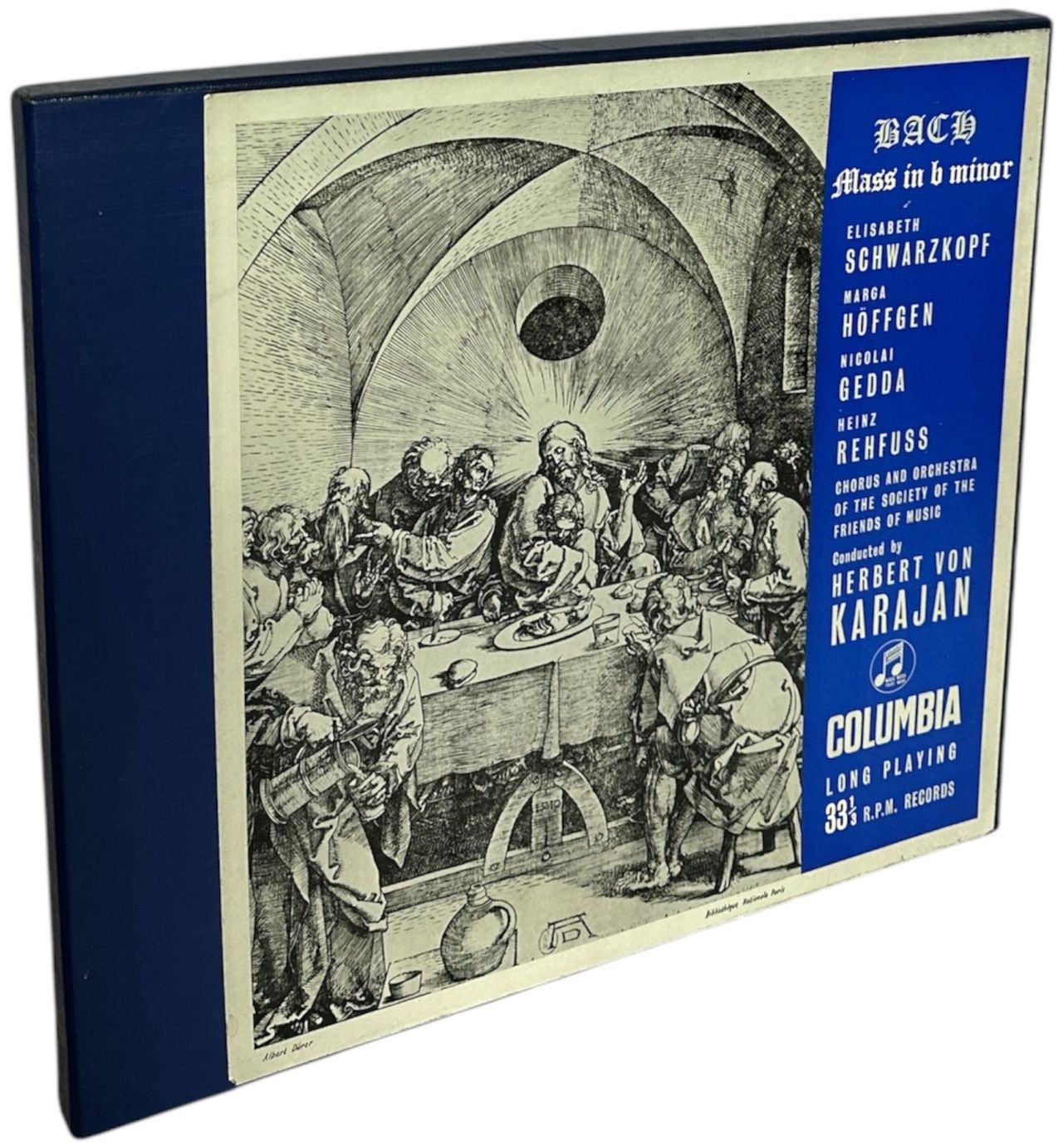 HERBERT VON KARAJAN conducts the CHORUS AND ORCHESTRA OF THE SOCIETY OF THE FRIENDS OF MUSIC Bach: Mass In B Minor (1950s UK 6-part 3-LP mono vinyl LP-set, with Elisabeth Schwarzkopf, Marga Hoffgen, Nicolai Gedda and Heinz Refuss, presented ina hinged 12" x 14" box with 8-page sleevenotes booklet. The box shows minimal wear and the vinyl is Near Mint 33CX1121-3)
