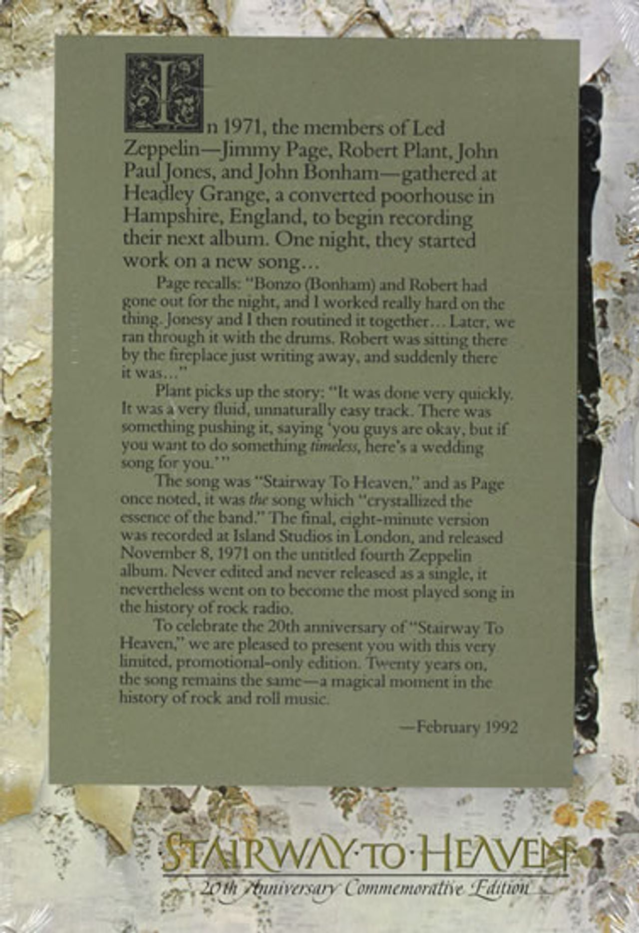 LED ZEPPELIN Stairway To Heaven - Special 20th Anniversary Commemorative Edition (Rare 1992 US limited promotional pack containing a vinyl 7" which plays the same version both sides & a one track CD, all housed in a unique 10" x 8" pop-up folder complete with song story/information sheet. This copy remains factory sealed from new, mint & unplayed PRCD4424-2)