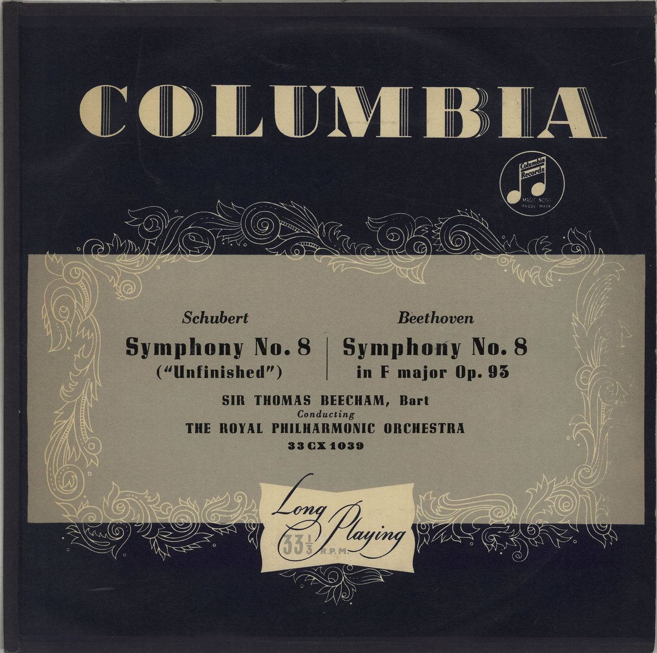 THE LONDON PHILHARMONIC ORCHESTRA conducted by SIR THOMAS BEECHAM Schubert: Symphony No. 8 ("Unfinished") / Beethoven: Symphony No. 8 in F Major, Op.93 (1952 UK LP on the blue and gold Columbia label, taped edge picture sleeve. The sleeve shows just a little light shelfwear & the vinyl remains in excellent condition with few signs of play 33CX1039)