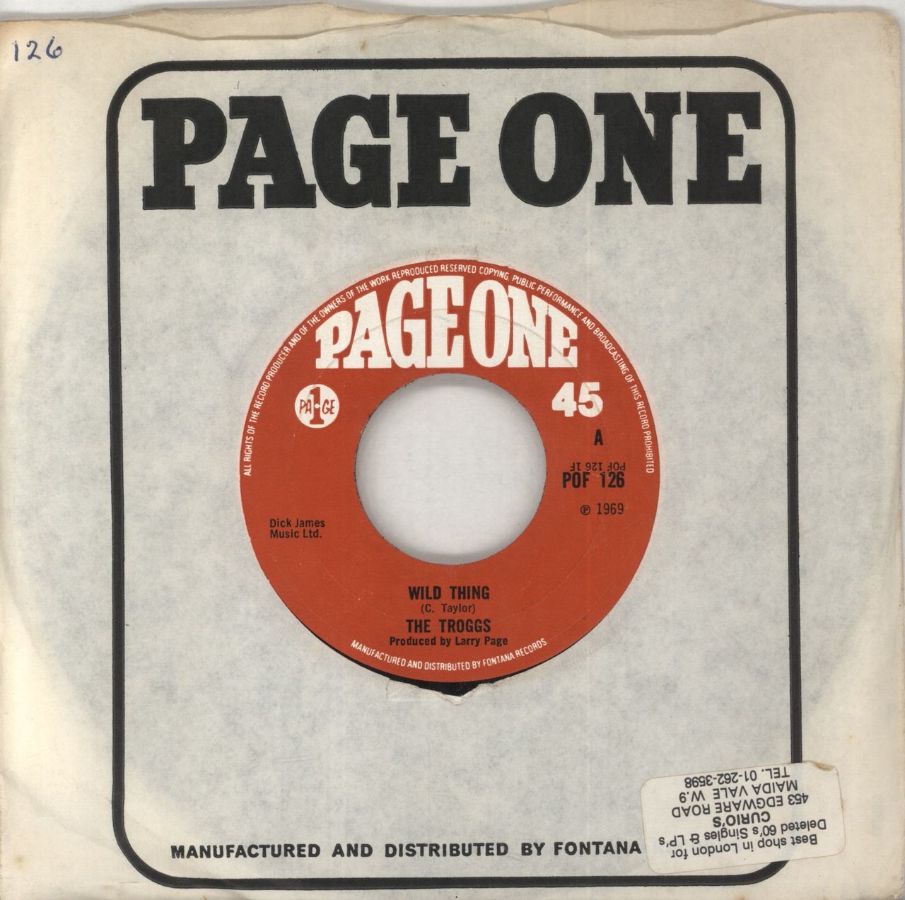 THE TROGGS Wild Thing (1969 UK wide-centred 7" vinyl single, includes I Can't Control Myself, Page One company paper sleeve. The sleeve has a vintage shop sticker to the front and the vinyl appears barely played POF126)