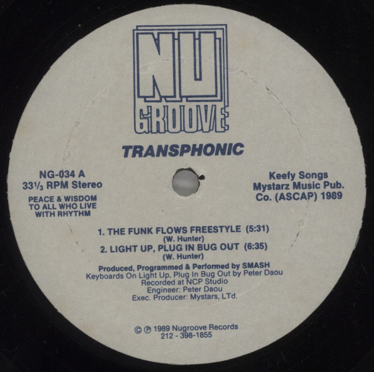 TRANSPHONIC The Funk Flows Freestyle (1989 US 3-track 12" vinyl single, includes Light Up, Plug In Bug Out and Jungle Tech, plain die-cut sleeve. The labels are clean and the vinyl is Near Mint NG-034)