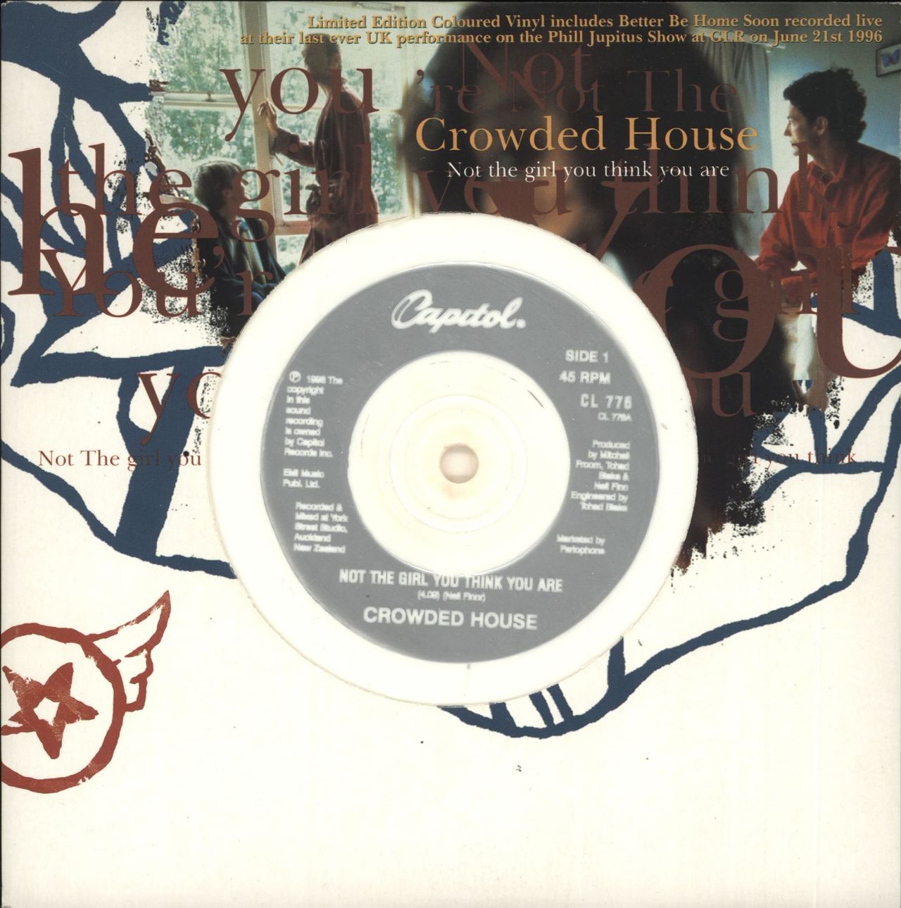 CROWDED HOUSE Not The Girl You Think You Are (1996 UK limited edition injection moulded 7" single pressed on White Vinyl, also including a live version of Better Be Home Soon recorded live at their 'last ever' UK performance on the PhillJupitus Show at GLR on 21st June 1996. The vinyl appears in excellent condition issued within the die-cut card picture sleeve CL776)