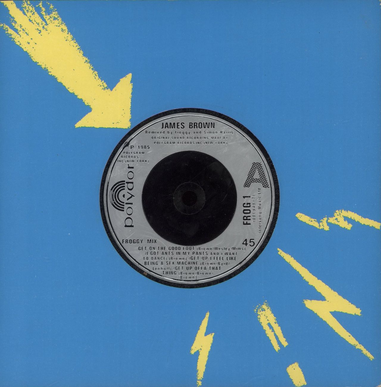 JAMES BROWN Froggy Mix (1985 UK injection moulded 7" vinyl single, featuring the mega-mixes from DJ Froggy & Simon Harris, Polydor company die-cut card sleeve FROG1)