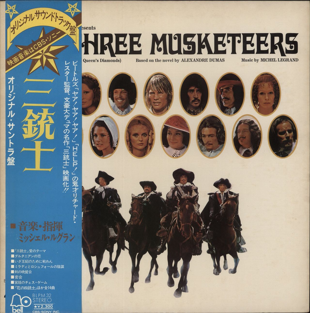 ORGINAL SOUNDTRACK The Three Musketeers (1974 Japanese sample 14-track vinyl LP with custom promotional Bell records labels, Michel Legrand's movie score, picture sleeve with Japanese insert & obi-strip. The sleeve shows light wear and the vinyl is Near Mint BLPM-32)