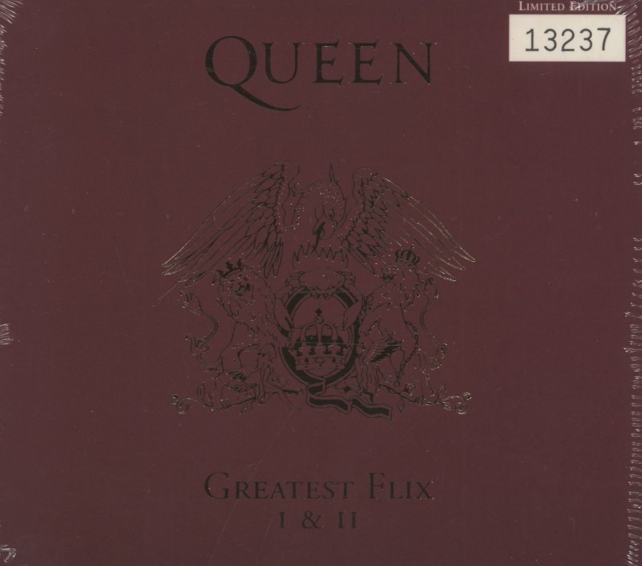 QUEEN Greatest Flix I & II (Rare 1997 UK limited promotional only double sided Region 2 DVD manufactured in Holland. Featuring the two classic volumes of the Greatest Flix release on one double sided disc. Housed in a custom maroon & gold embossed digipak-style picture sleeve with the iconic Queen crest and text on the back in gold, and individually numbered. This was produced to help promote a DVD player manufactured by Pioneer, however, after Pioneer had to re-call the player dueto technical problems, thousands of this set never saw the light of day and were destroyed. The majority of these were later available at the 23rd Queen Fan Convention in 2008. Now a difficult item to find, this example remains factory sealed, unopened and unplayed! QDVD001)