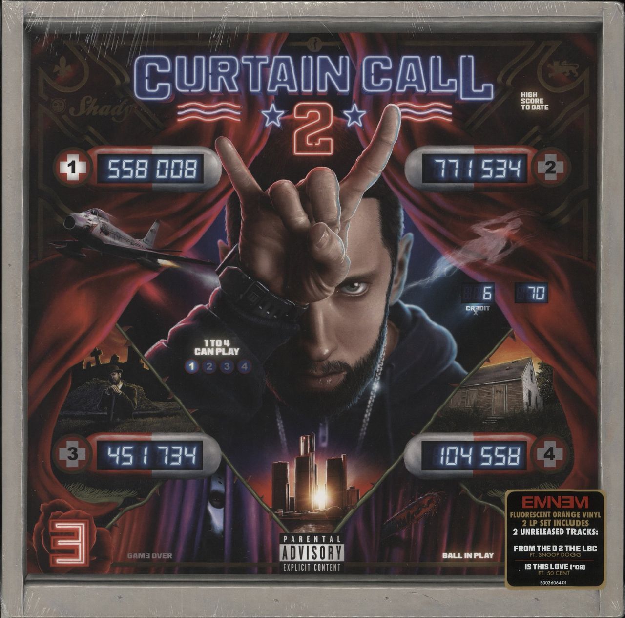 EMINEM Curtain Call 2 (2022 US Webstore exclusive limited edition 20-track double LP pressed on ORANGE FLUORESCENT VINYL, includes two previously unreleased tracks - From The D 2 The LBC [featuring Snoop Dogg] and Is This Love '09 [featuring 50 Cent]. Housed in a gatefold picture sleeve - still sealed in its hype-stickered shrinkwrap)