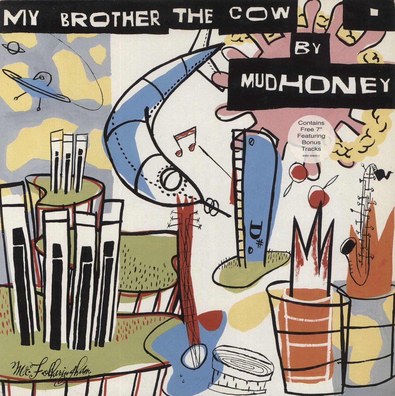 MUDHONEY My Brother The Cow (1995 US limited edition 12-track LP on a retro tri-colour steamboat label, complete with the bonus 6-track vinyl 7" [PRO-S-7492] featuring Mudhoney Funky Butt, West Seattle Hardcore, Sissy Bar, Carjack 94, Sailor &Small Animals. Housed in a hype stickered picture sleeve. The sleeve shows some corner and edgewear and the vinyl shows only light signs of play)