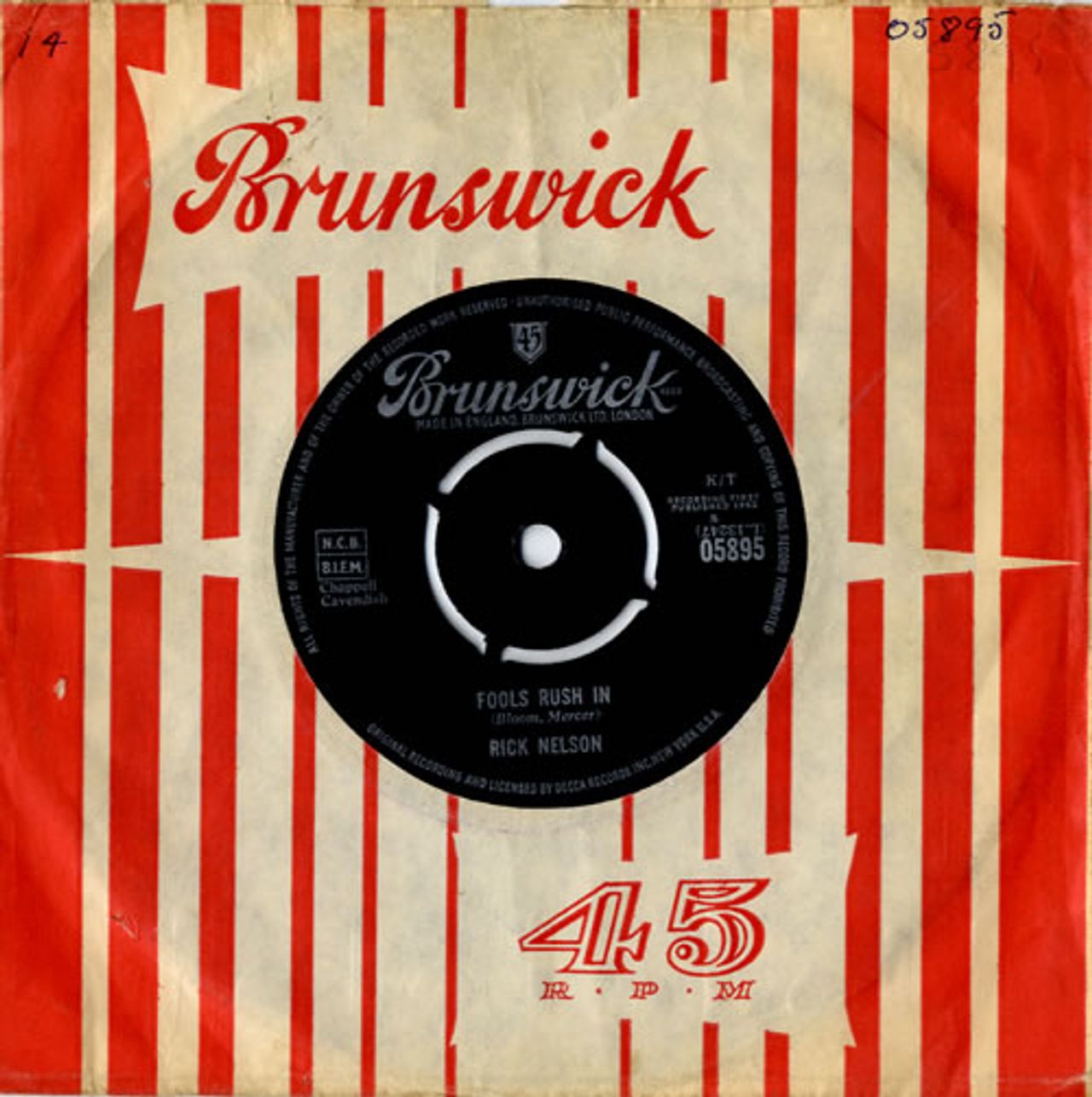 RICK NELSON Fools Rush In (1963 UK 7" vinyl single with intact four prong centre, also including Down Home, Brunswick company die cut paper sleeve. The vinyl on this copy remains in excellent condition with just a few light surface scuffs to show for its fifty plus years)
