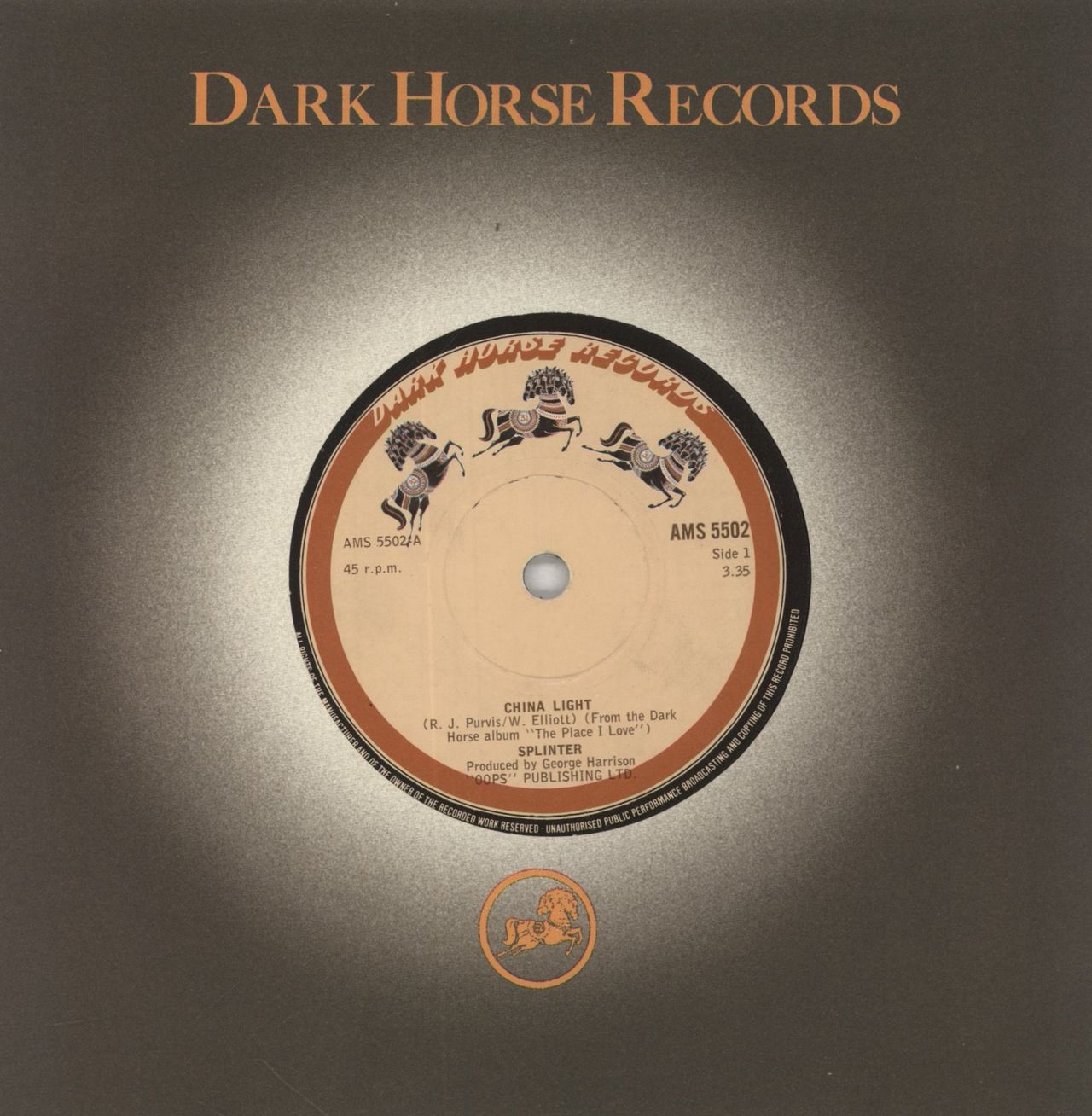SPLINTER China Light (1975 UK solid centre 7" vinyl single produced by George Harrison, also including Drink All Day, Dark Horse reproduction die-cut company paper sleeve. The vinyl remains Excellent with just a few light cosmetic paper scuffsAMS5502)