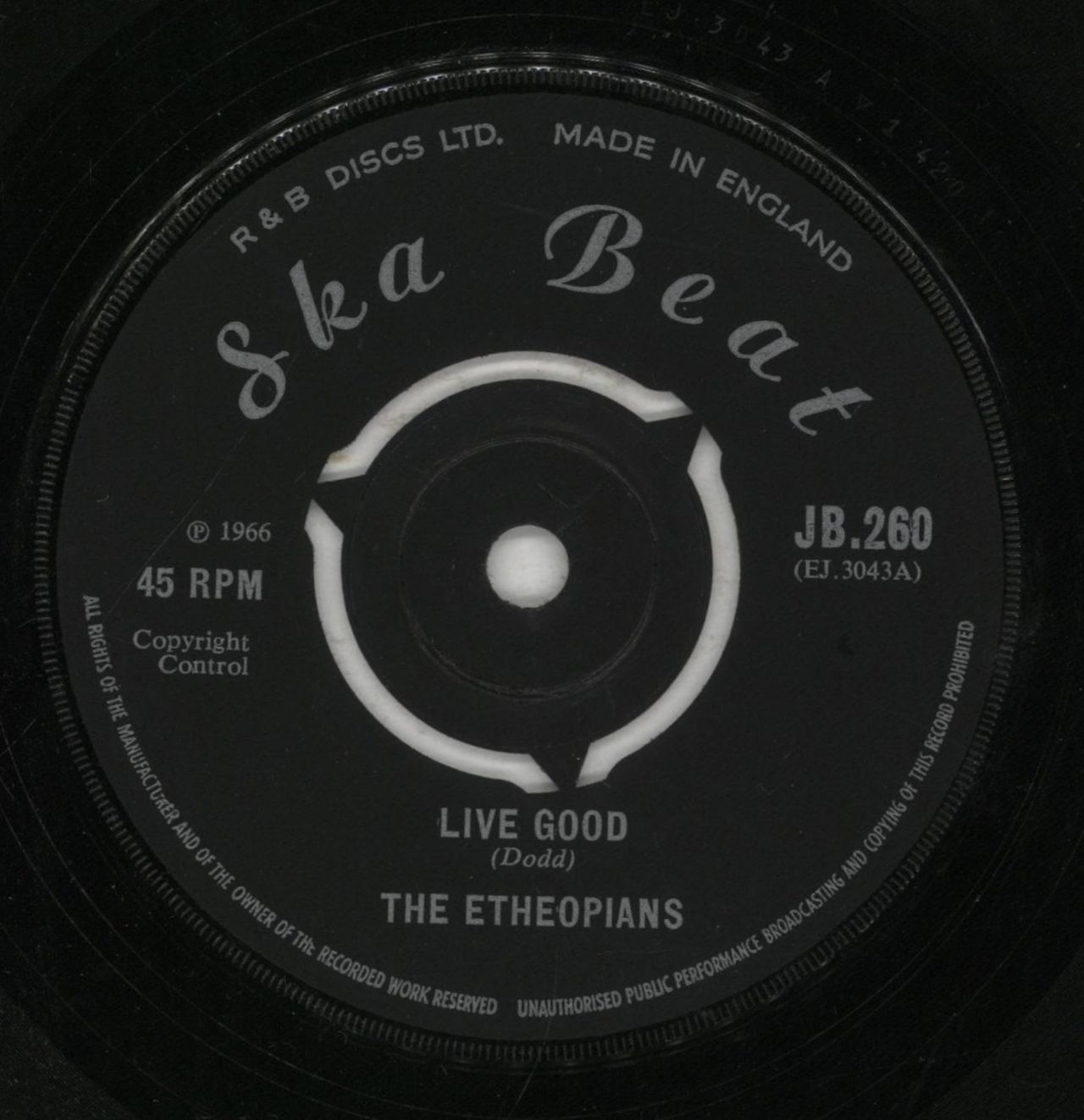 THE ETHEOPIANS Live Good (Rare original 1966 UK 3-prong circular Ska Beat label 7" vinyl single with Soul Bros 'Soho' on the flip-side, plain white die cut paper sleeve. The vinyl has very little signs of play with just light surface scuffs on the Souls Bros track. This is the first copy we hae seen of this collectible ska, rocksteady single! JB260)