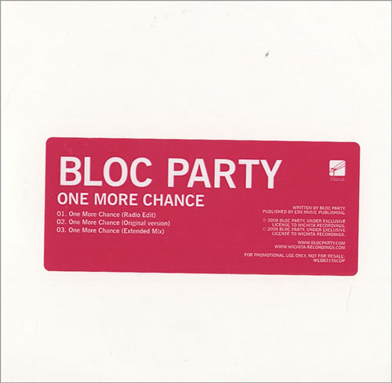 BLOC PARTY One More Chance (2009 UK 3-track promotional CD from the London indie rockers, featuring the track which was omitted from their Intimacy album. Produced by Jacknife Lee and includes the Radio Edit, Original Version and Extended Mix.The custom pink disc sits inside the custom stickered white card sleeve)