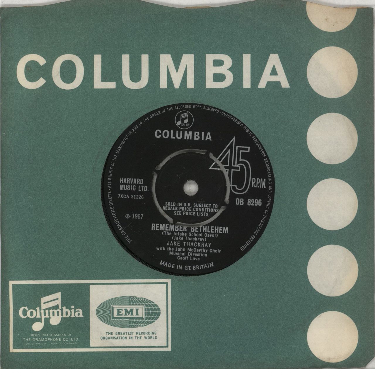 JAKE THACKRAY Remember Bethlehem (The Intake School Carol) (1967 UK 7" vinyl single with four-prong centre, includes Joseph, Columbia die-cut sleeve DB8296)