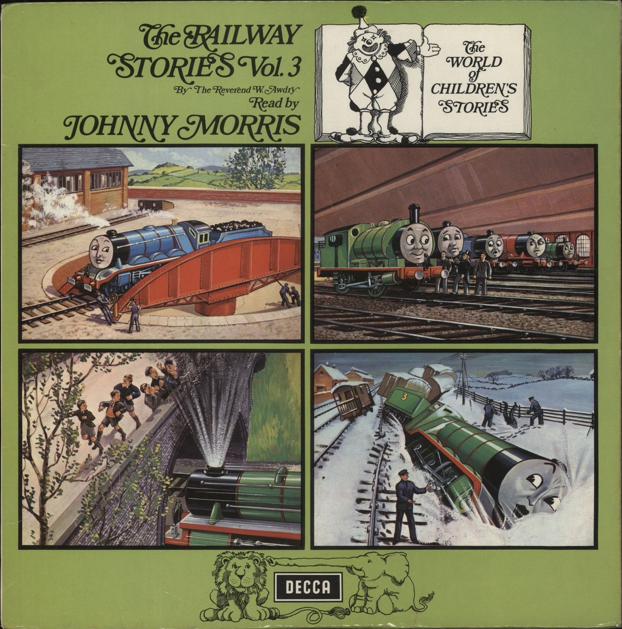 JOHNNY MORRIS The Railway Stories Vol. 3 (1972 UK 8-track MONO vinyl LP, readings of the tales of Thomas The Tank Engine & friends written by Rev W. Awdry, front laminated picture sleeve featuring great illustrations of the engines in their original style, before they became overly cute. The sleeve shows some light creasing and the vinyl remains Near Mint PA272)