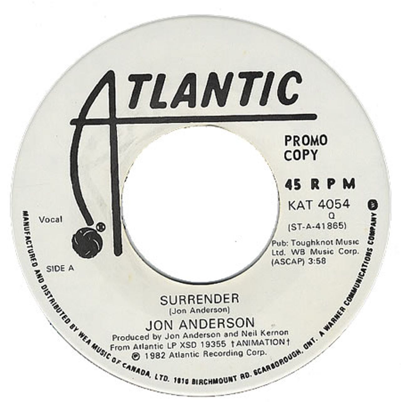 JON ANDERSON Surrender (Original 1982 Canadian Atlantic white title label "promo copy" DJ only 7" single also with Spider on the b-side. Issued to radio and DJs in a plain die cut paper sleeve KAT4054)