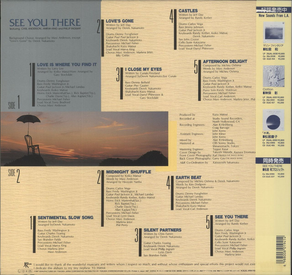 KAZU MATSUI See You There (Rare 1987 Japanese 10 track vinyl LP featuring 'Love's Gone' & 'Midnight Shuffle, picture sleeve with fold out lyric inner and intact obi strip. Both sleeve and vinyl are in stunning Near Mint condition thirty-eight years on. Recommended. 28JAL-3094)