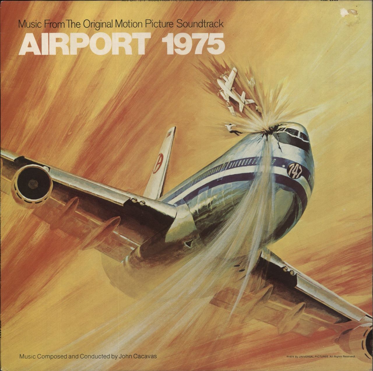 ORIGINAL SOUNDTRACK Airport 1975 (1974 UK 11-track LP, a great soundtrack by John Cacavas for the mid seventies disaster movie, picture sleeve. The sleeve shows a small area of paperloss due to a previous sticker removal & the vinyl is Excellent with just the odd minor sign of play - great play copy MCF2583)