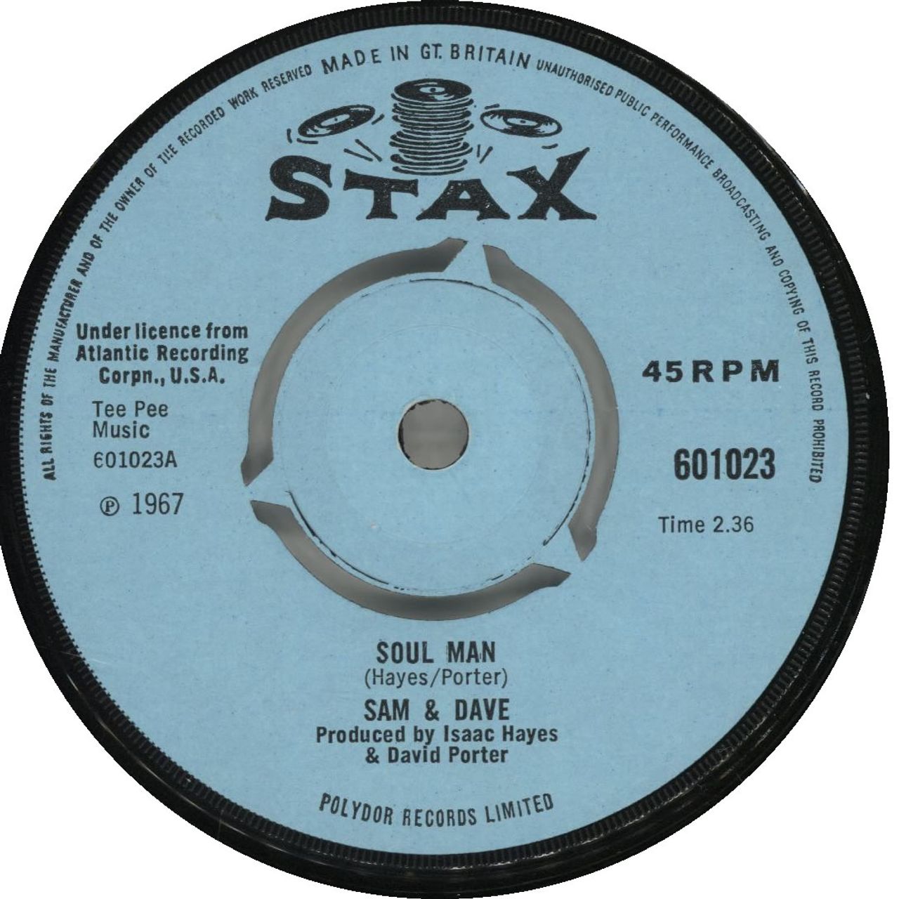 SAM & DAVE Soul Man (Classic 1967 7'' vinyl single with three prong centre, also including May I Baby, with both numbers written & produced by Isaac Hayes & David Porter, plain die-cut paper sleeve)