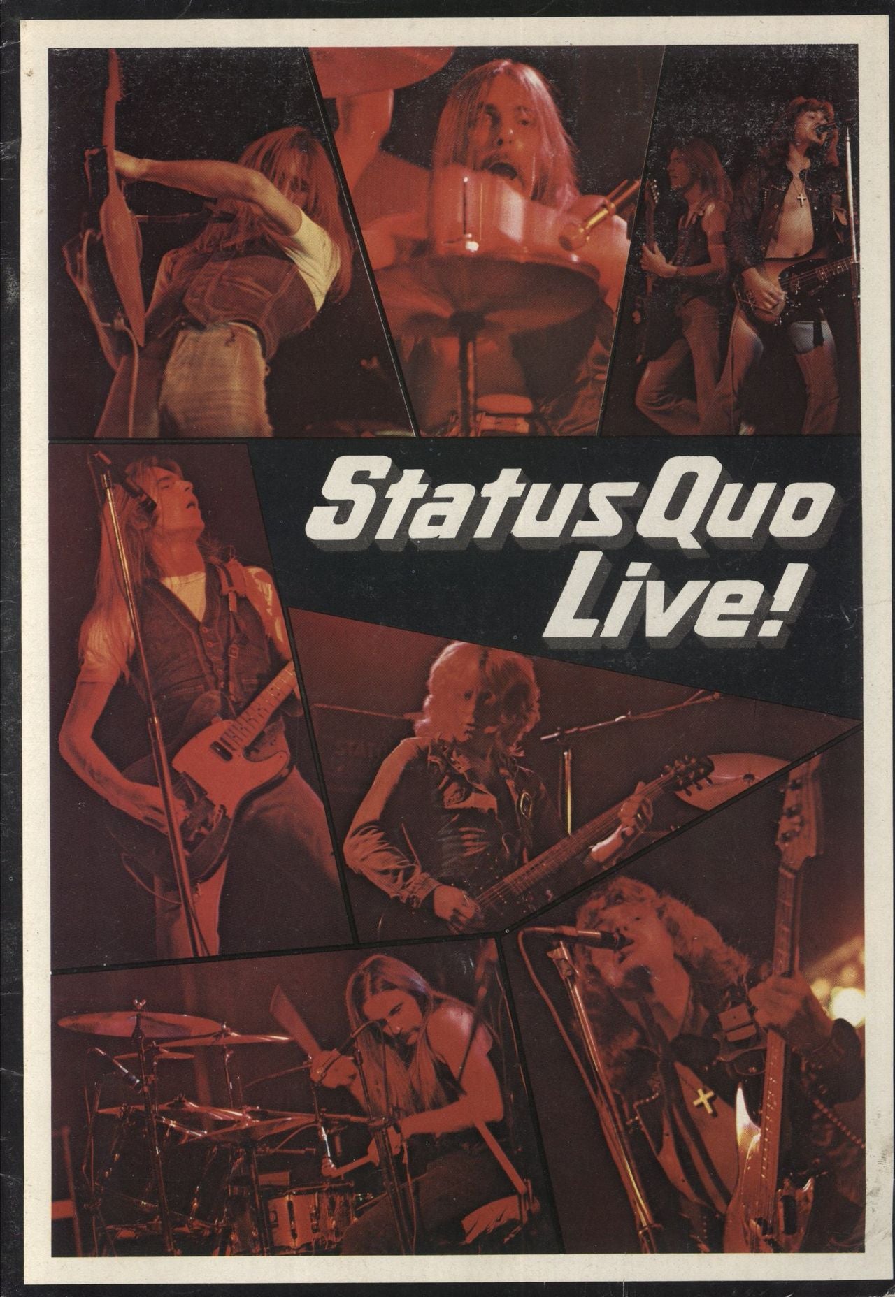 STATUS QUO Live! (Rare original 1975 UK 8" x 11.5" tour programme featuring twenty pages crammed with photos, details about the band and an introduction by John Peel, plus a great cover featuring a live on stage photo montage. The cover displays some light general wear with a little corner/spine creasing evident and some minor edge wear/chipping but otherwise remains in an Excellent condition)