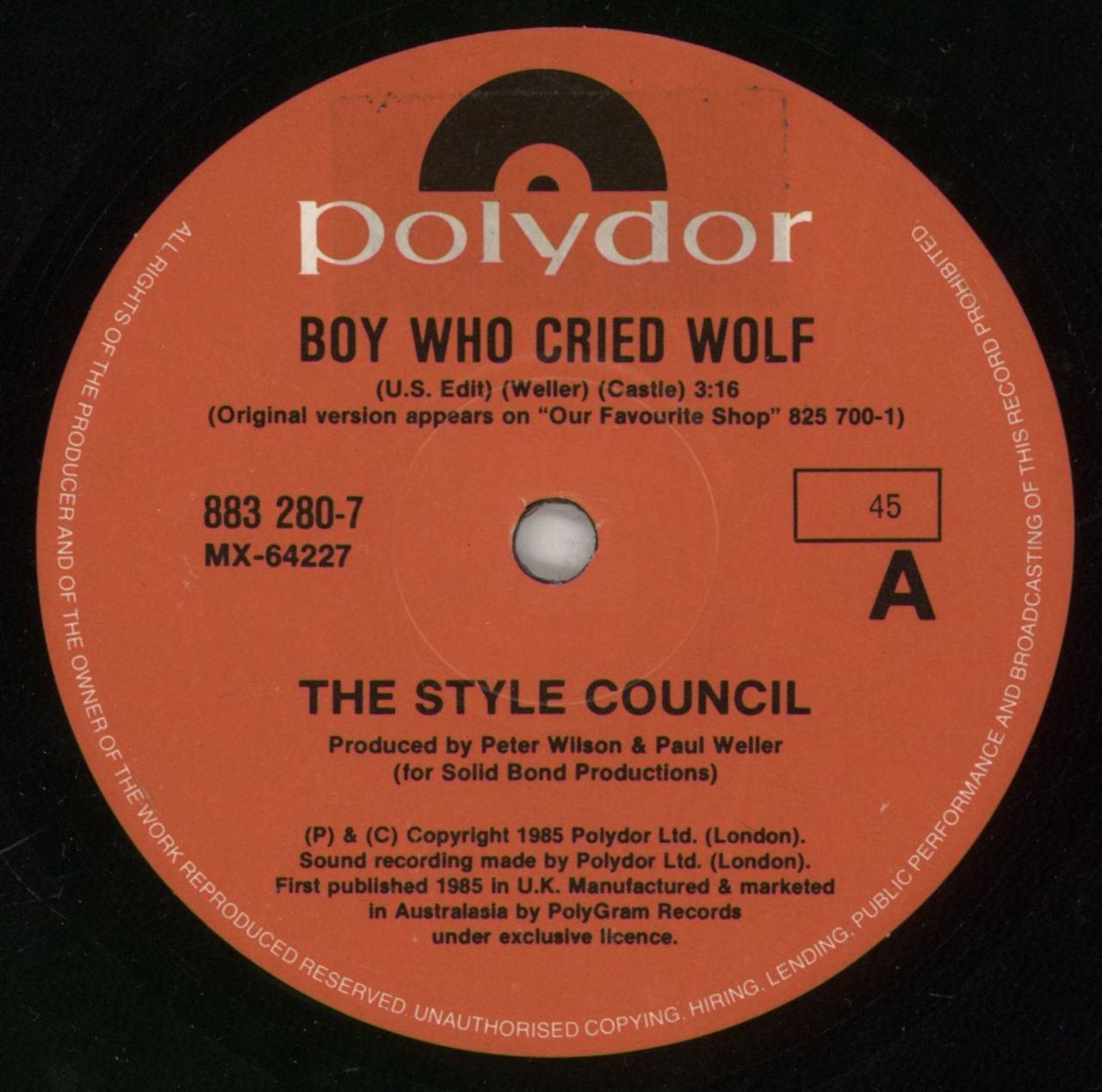 THE STYLE COUNCIL Boy Who Cried Wolf (1985 Australian 7" vinyl single, also including [When You] Call Me, plain die-cut paper sleeve. The vinyl appears in near as new condition)