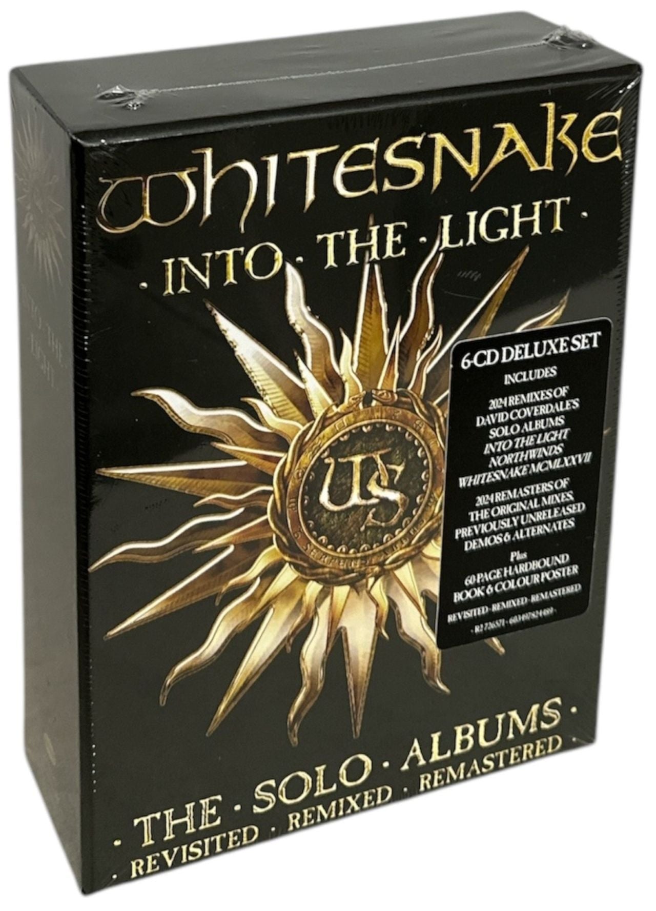 WHITESNAKE Into The Light: The Solo Albums (2024 UK/US/EU 107-track 6-CD boxset, includes tracks from the solo albums of David Coverdale, the band's founder and-singer-songwriter: White Snake (1977), Northwinds (1978) and Into the Light (2000). The collection also includes "revisited, remixed and remastered" versions of material from these solo albums as well as a 60-page hardbound book and full colour poster. Factory sealed)