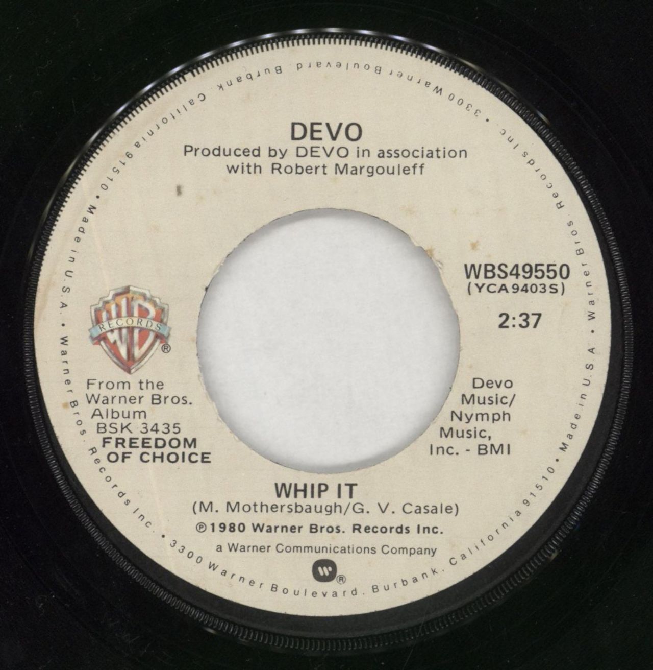 DEVO Whip It (1980 US wide-centred 7" vinyl single, also including Turn Around, plain die-cut paper sleeve WBS49550)