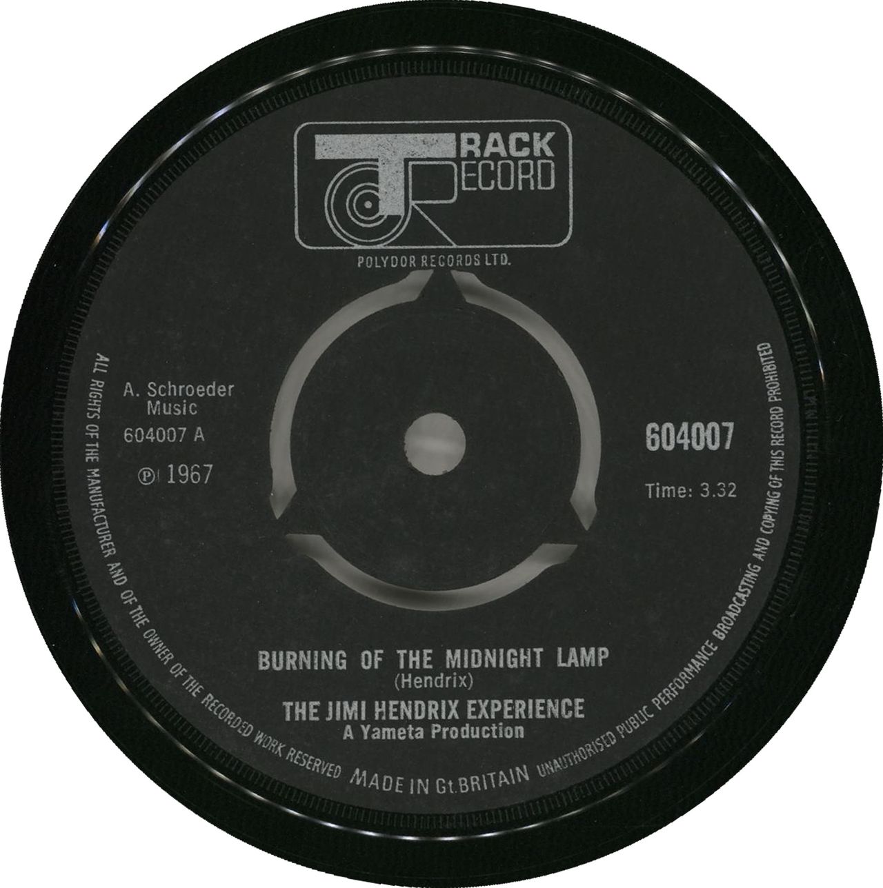 JIMI HENDRIX Burning Of The Midnight Lamp (1967 UK 7" single with original three prong centre, also featuring The Stars That Play With Laughing Sam's Dice, plain company die cut paper sleeve. The vinyl grades Very Good with some minor scuffs &faintcosmetic surface marks which have little to no effect on play)