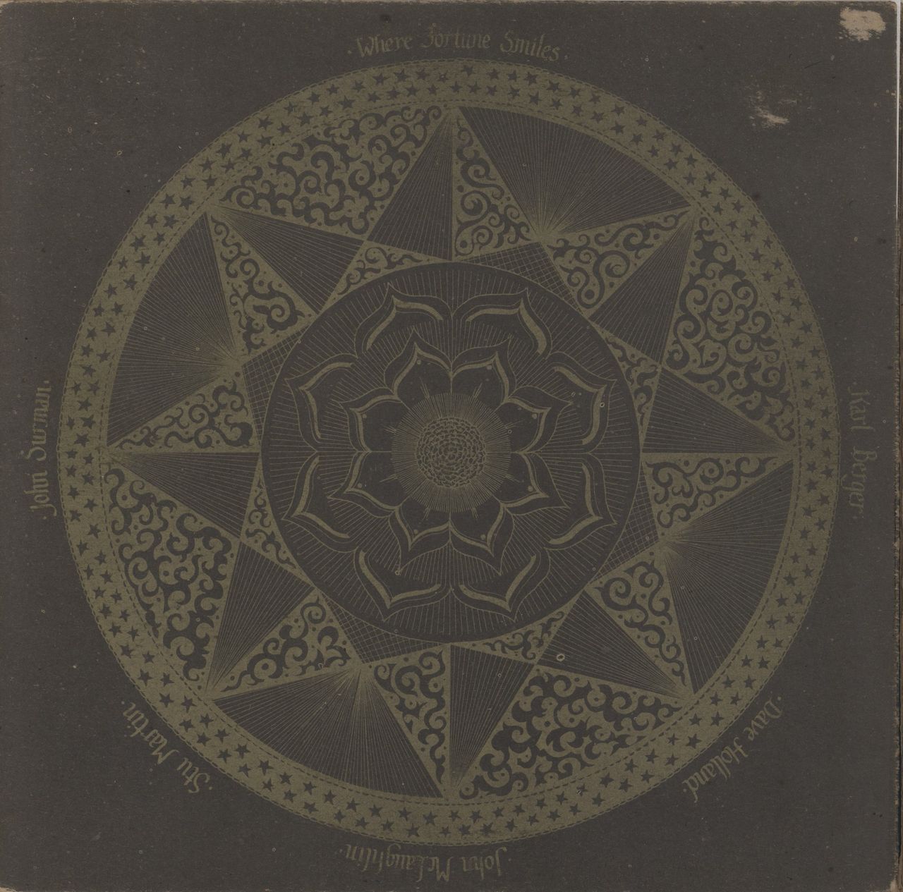 JOHN MCLAUGHLIN Where Fortune Smiles (1971 UK first issue orange Dawn label 5-track vinyl LP, also featuring the talents of John Surman, Karl Berger, Stu Martin & Dave Holland, textured gatefold picture sleeve complete with fold-out information leaflet. The sleeve has an area of paper loss to one corner and some general storage wear over time, while the vinyl has just light signs of play. Overall a Very Good copy of this rarity! DNLS3018)