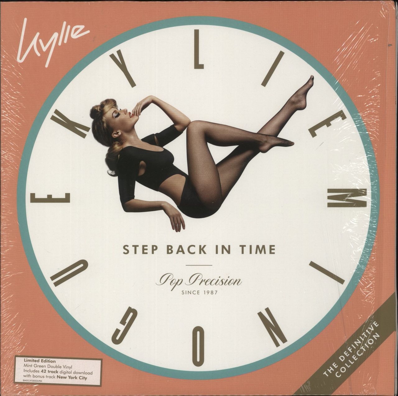 KYLIE MINOGUE Step Back In Time: The Definitive Collection (2019 UK limited edition 20-track double LP set pressed on Mint Green Vinyl. With decades of hits under her belt, this sparkling collection bringstogether some of Kylie's greatest hits, including Can't Get You Out Of My Head, Spinning Around, In Your Eyes, On A Night Like This, Step Back In Time, Better The Devil You Know, I Should Be So Lucky, 2 Hearts and more plus the new recording Dancing. The picture sleeve retains its opened hype-stickered shrink and comes with the two ultra glossy credit printed inners and the two vinyl discs look barely played)