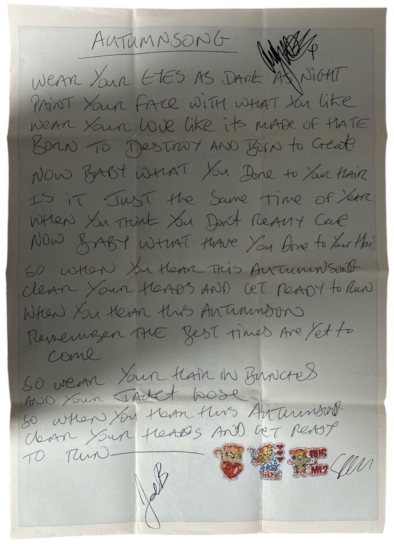 MANIC STREET PREACHERS Autumn Song Lyric Poster (Rare 2007 UK limited edition FULLY AUTOGRAPHED lyric poster which has been signed by James Dean Bradfield, Nicky Wire and Sean in black marker pen. This poster has been folded to keep it safe intransit to us. This would look fantastic framed on the wall.)