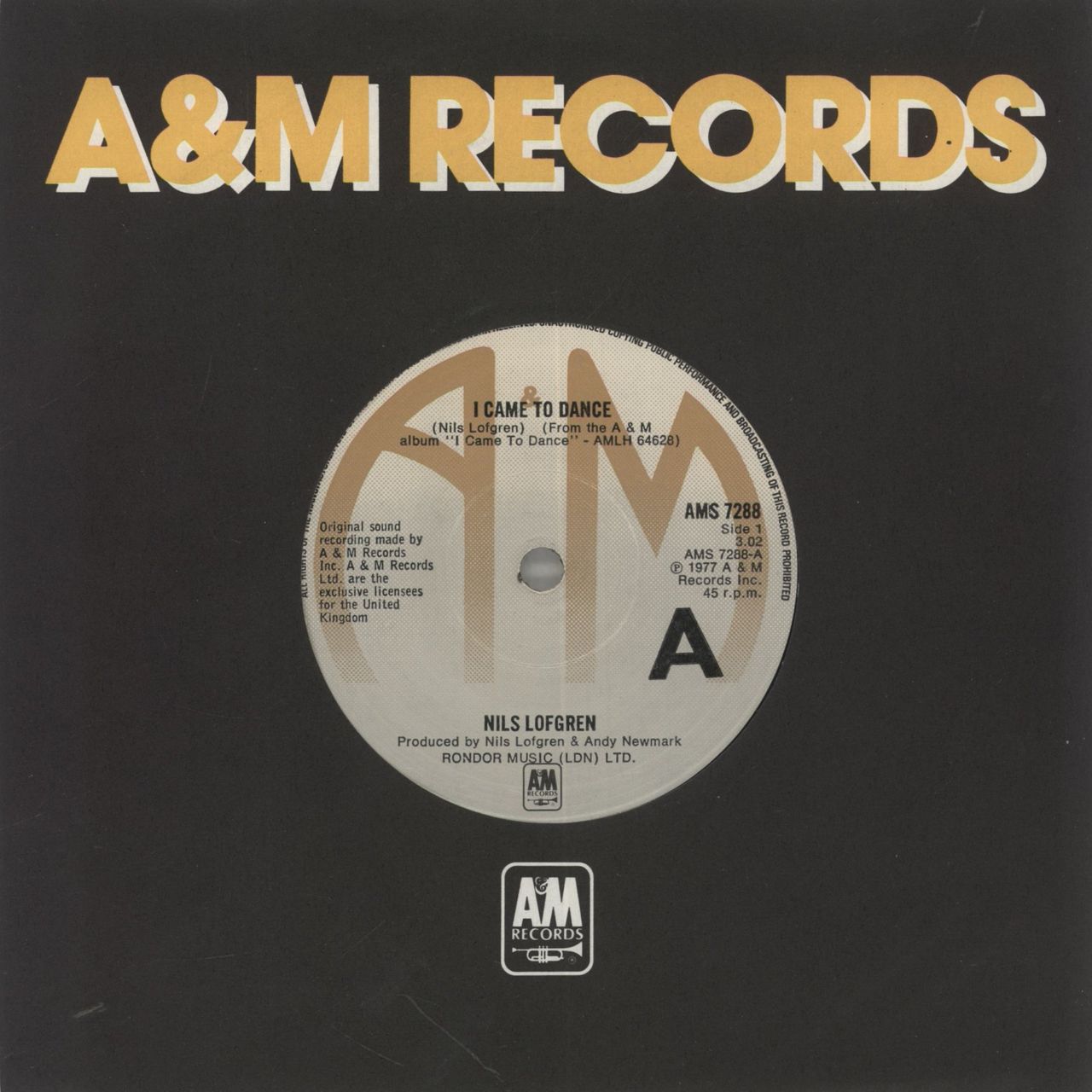 NILS LOFGREN I Came To Dance (1977 UK solid centre 7" vinyl single, also including Code Of The Road, A&M company die cut paper sleeve AMS7288)