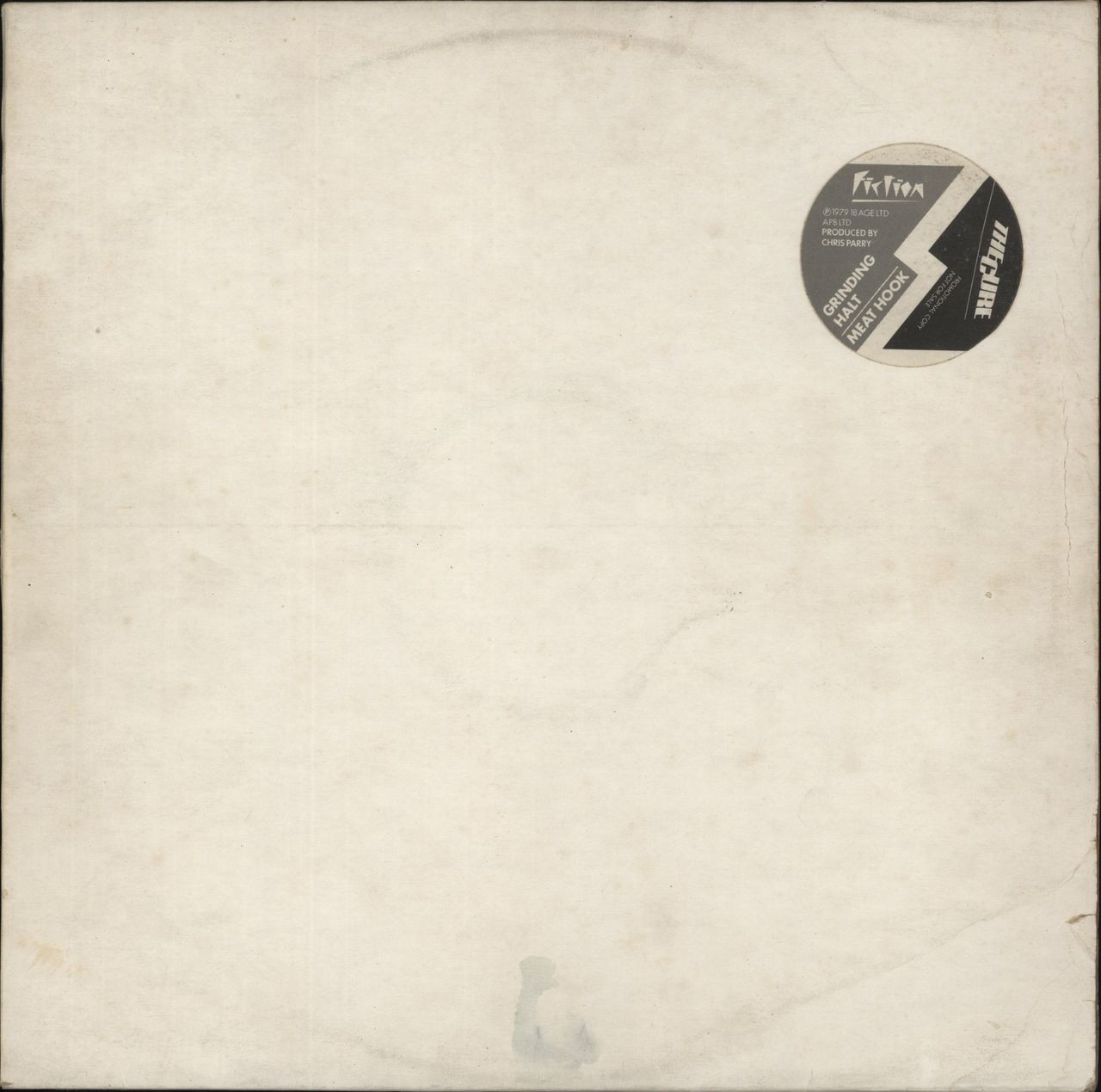 THE CURE Grinding Halt (Super Rare 1979 UK promotional-only vinyl 12" with black & white paper labels with custom 'Not For Sale' print, machine stamped matrices & 'Strawberry' etched in the run-outs. This was originally considered for being The Cure's second single but was aborted in favour of 'Boys Don't Cry' after feedback from radio programmers was less enthusiastic. This is now considered to be one of the hardest Cure promotional items to find! Also includes the b-side 'Meat Hook'. Comes housed in the original custom-stickered plain card sleeve. The sleeve displays some discolouration and creasing to the opening edge leavin it in Very Good condition & the vinyl is in Excellent condition. A fantastic copy of this hard to find promo CUR-1)
